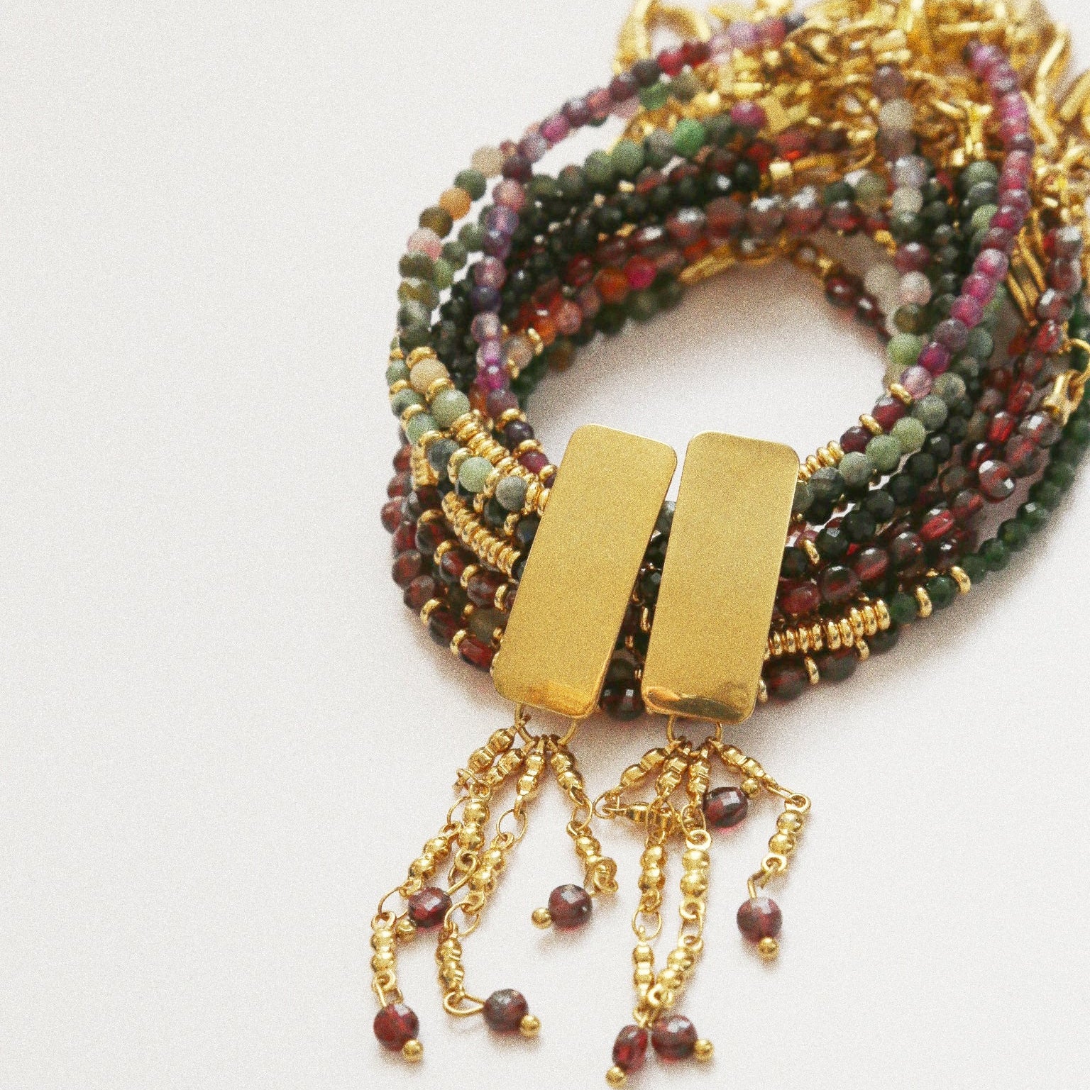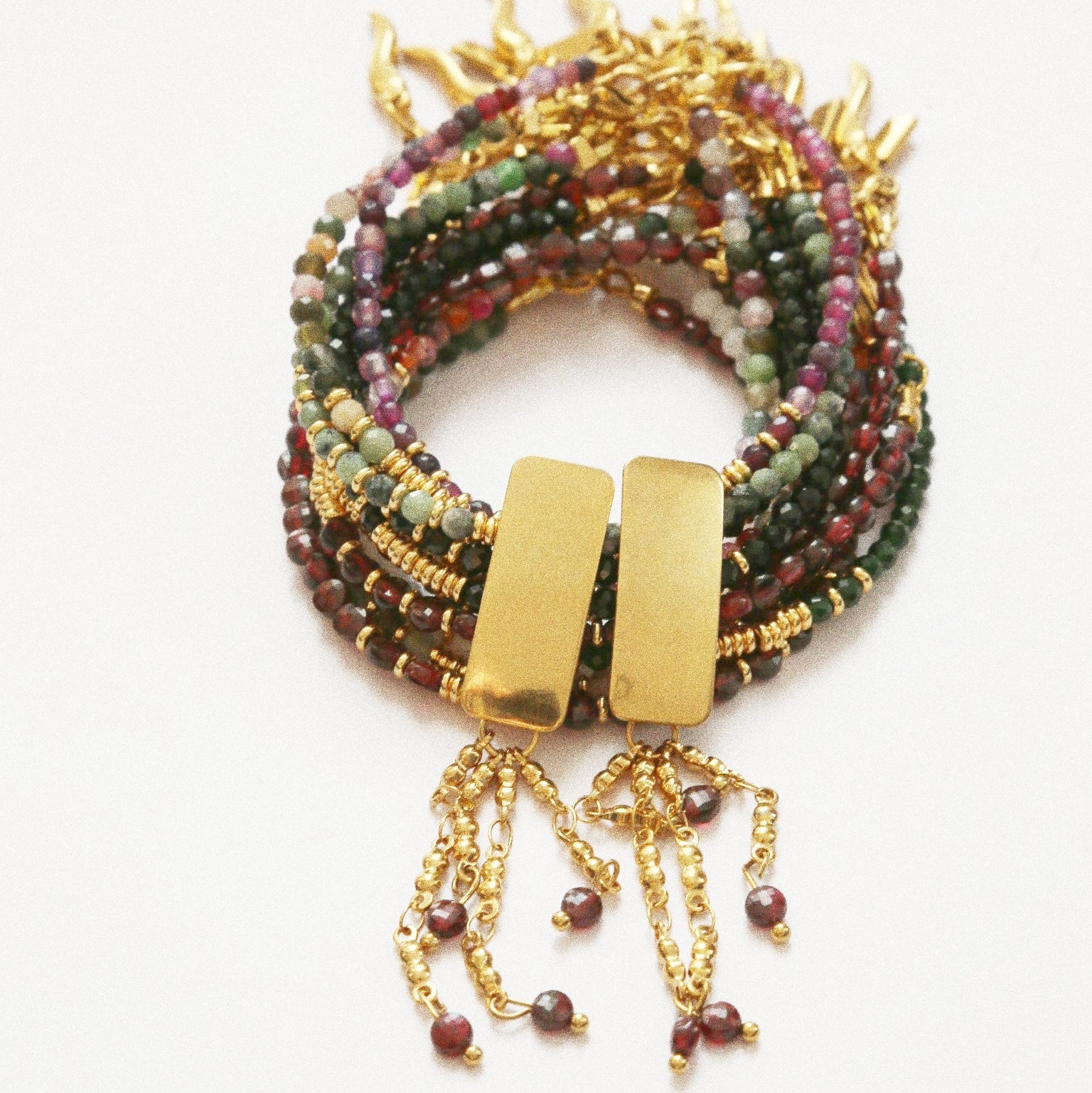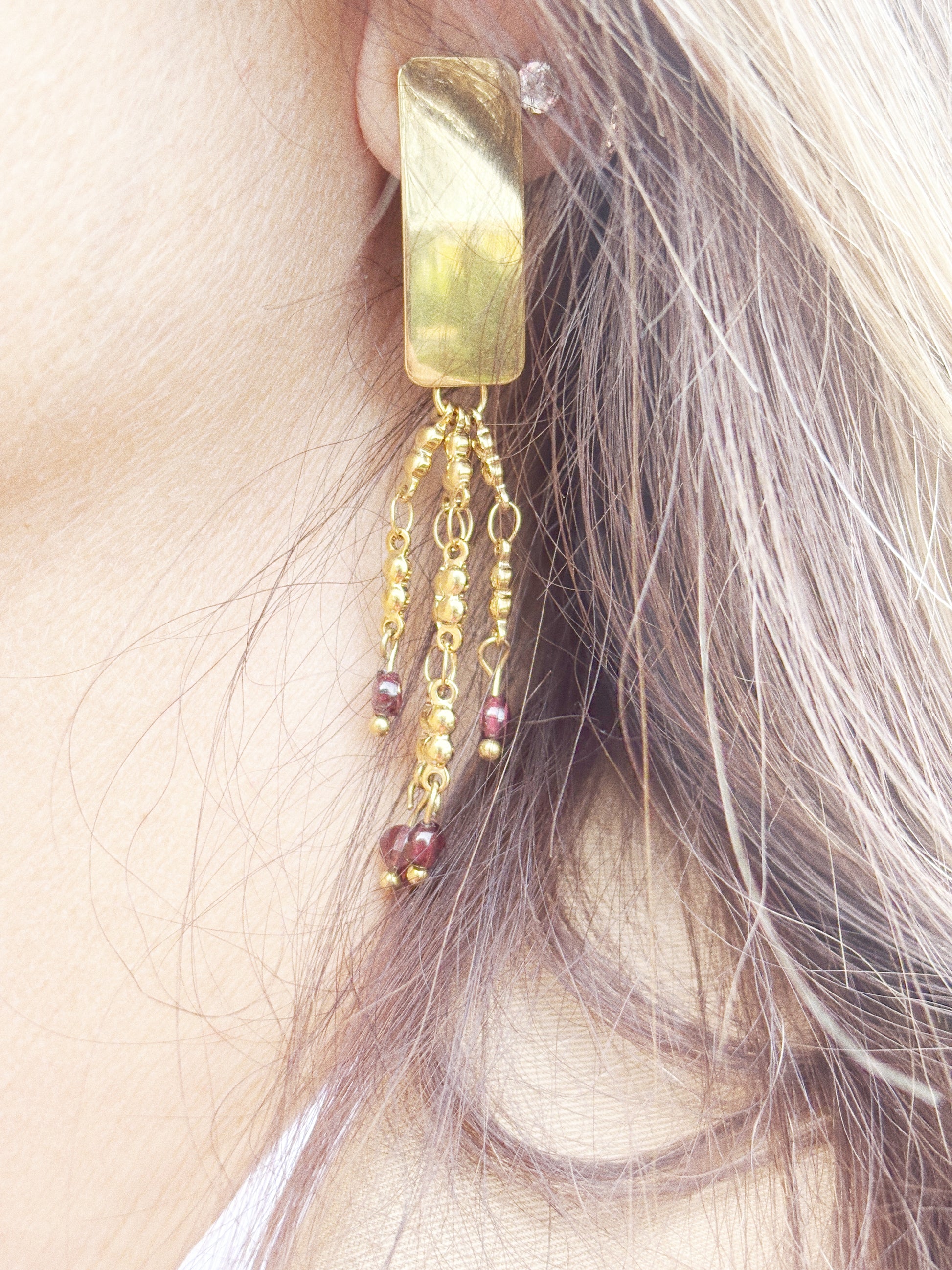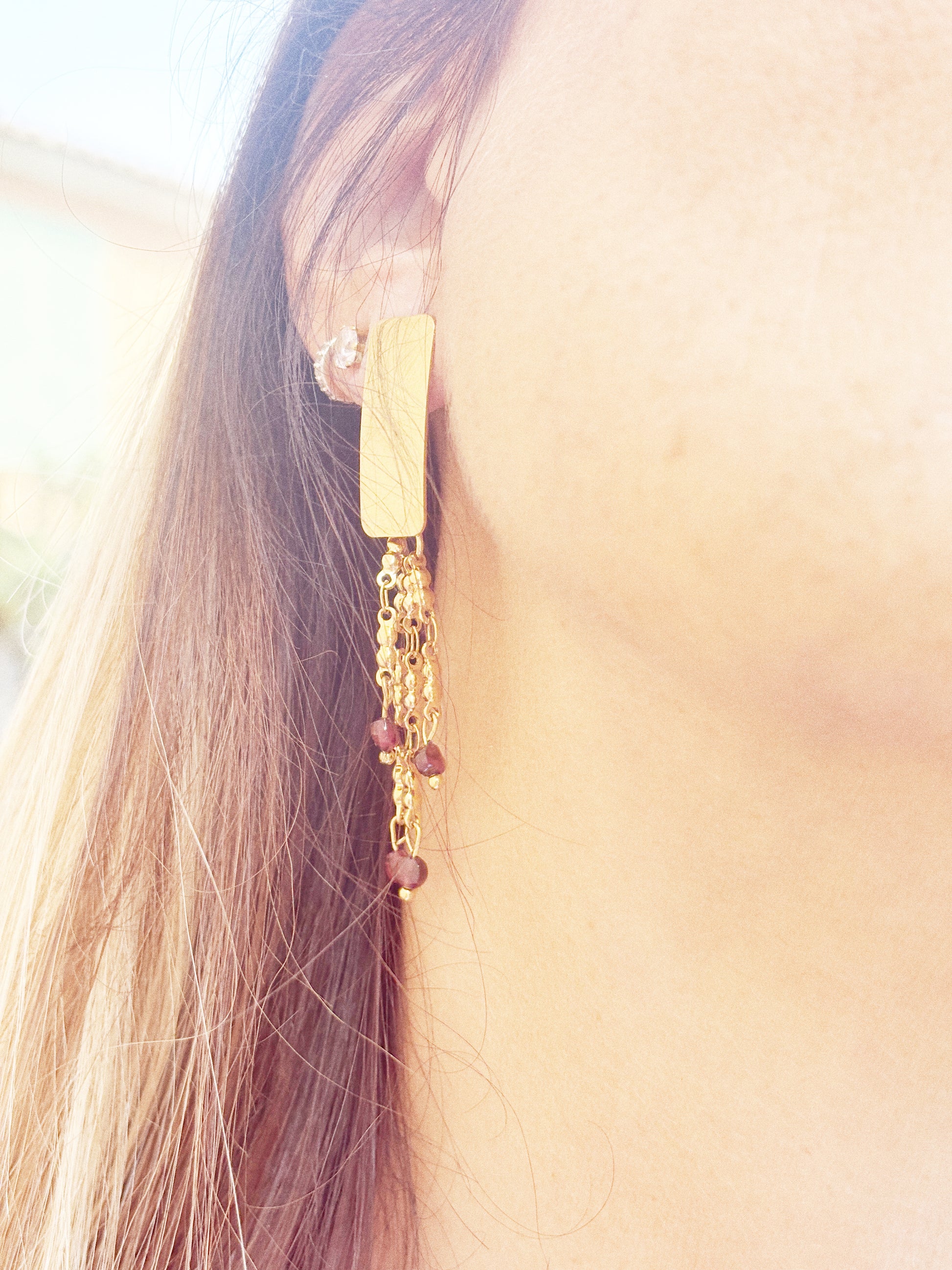 Chaque dĂ©tail, du rectangle dorĂ© au tombĂ© fluide de ses chaĂźnettes ornĂ©es de perles de grenat, a Ă©tĂ© pensĂ© pour capturer la lumiĂšre et sublimer le port de tĂȘte.