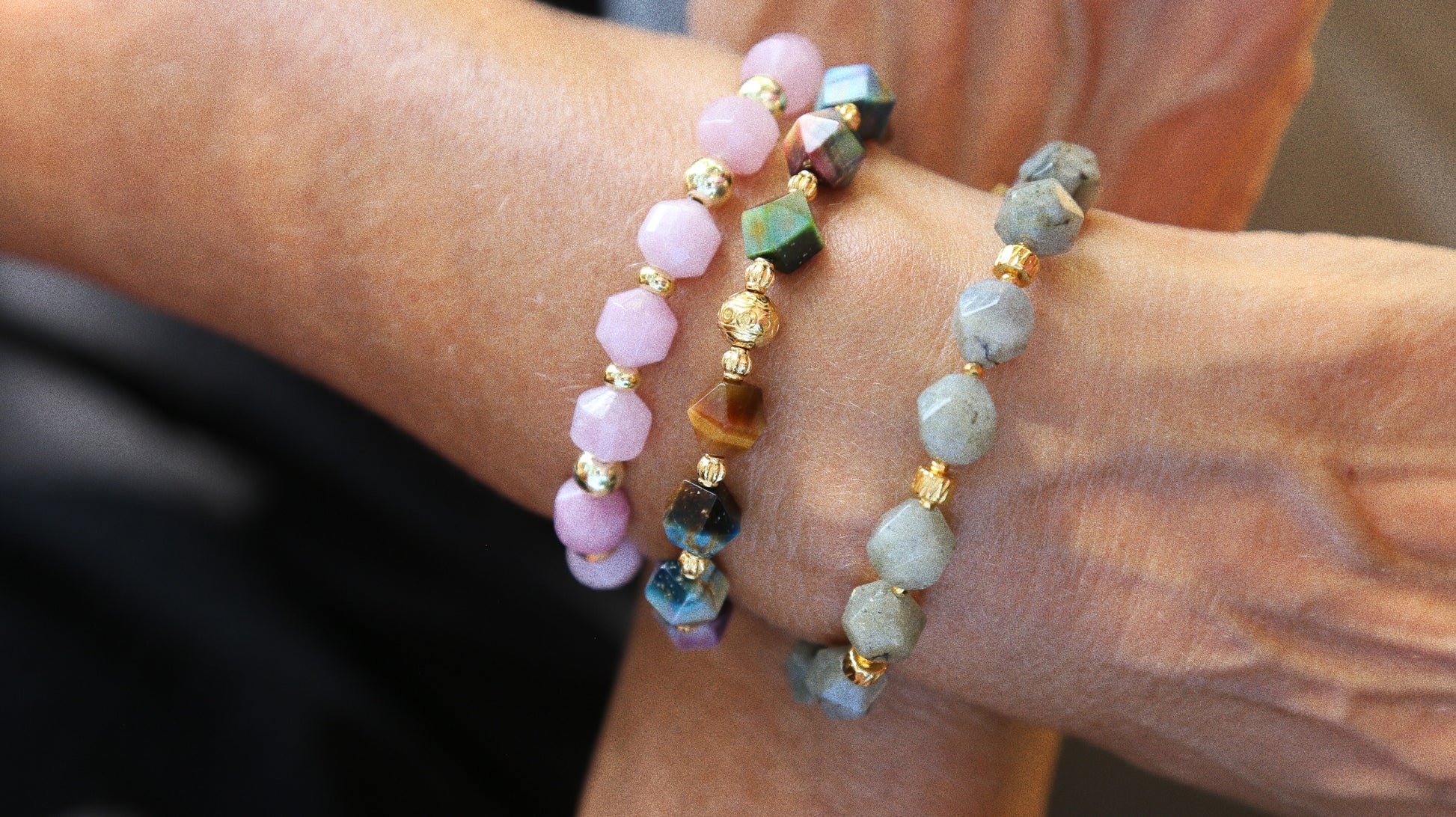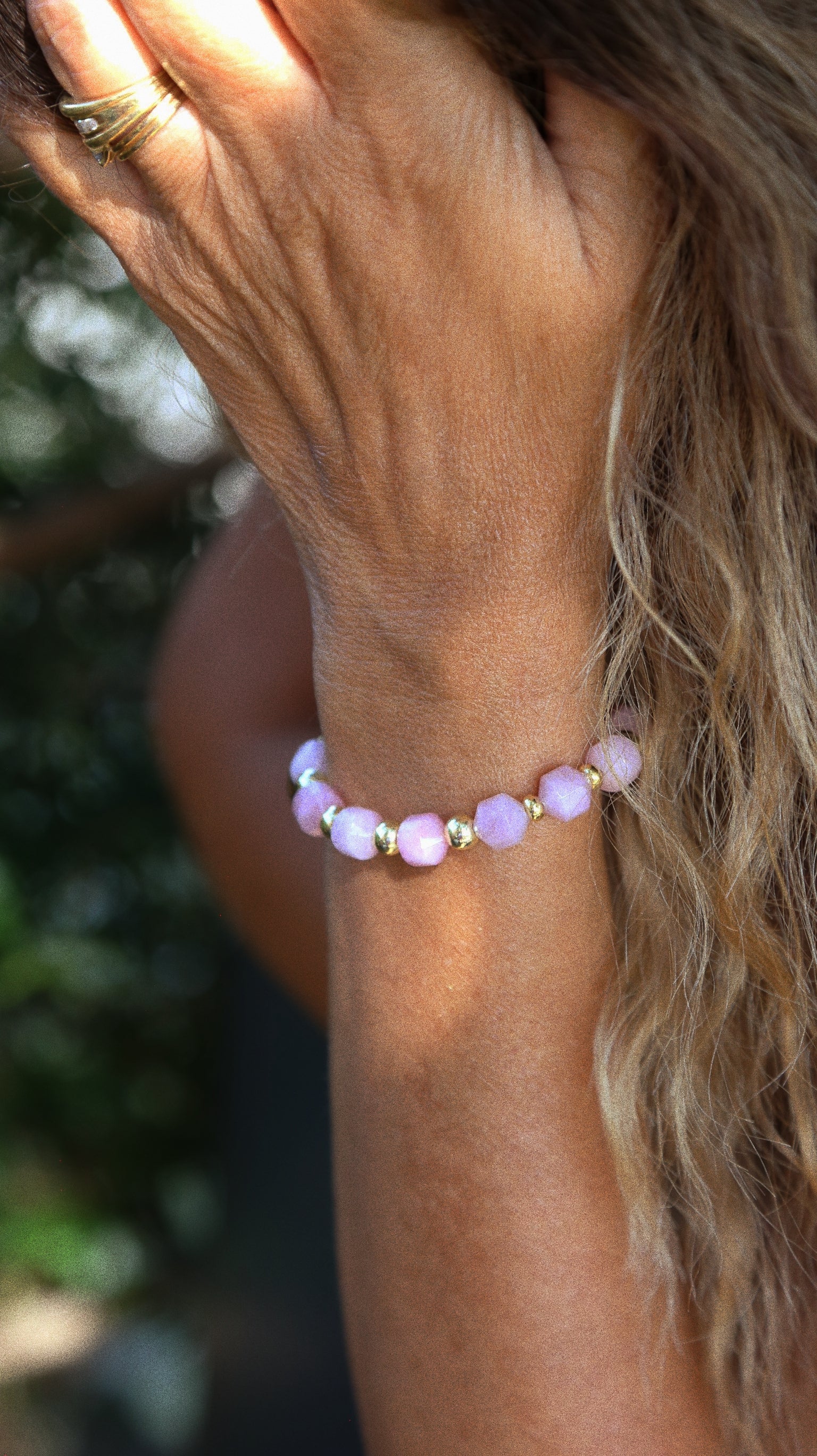 Il est composé de perles naturelles d’howlite rose, pierre qui favorise la sérénité, l’apaisement et l’ouverture du cœur, et rehaussé de perles dorées en plaqué or 18k qui apporte lumière et élégance.