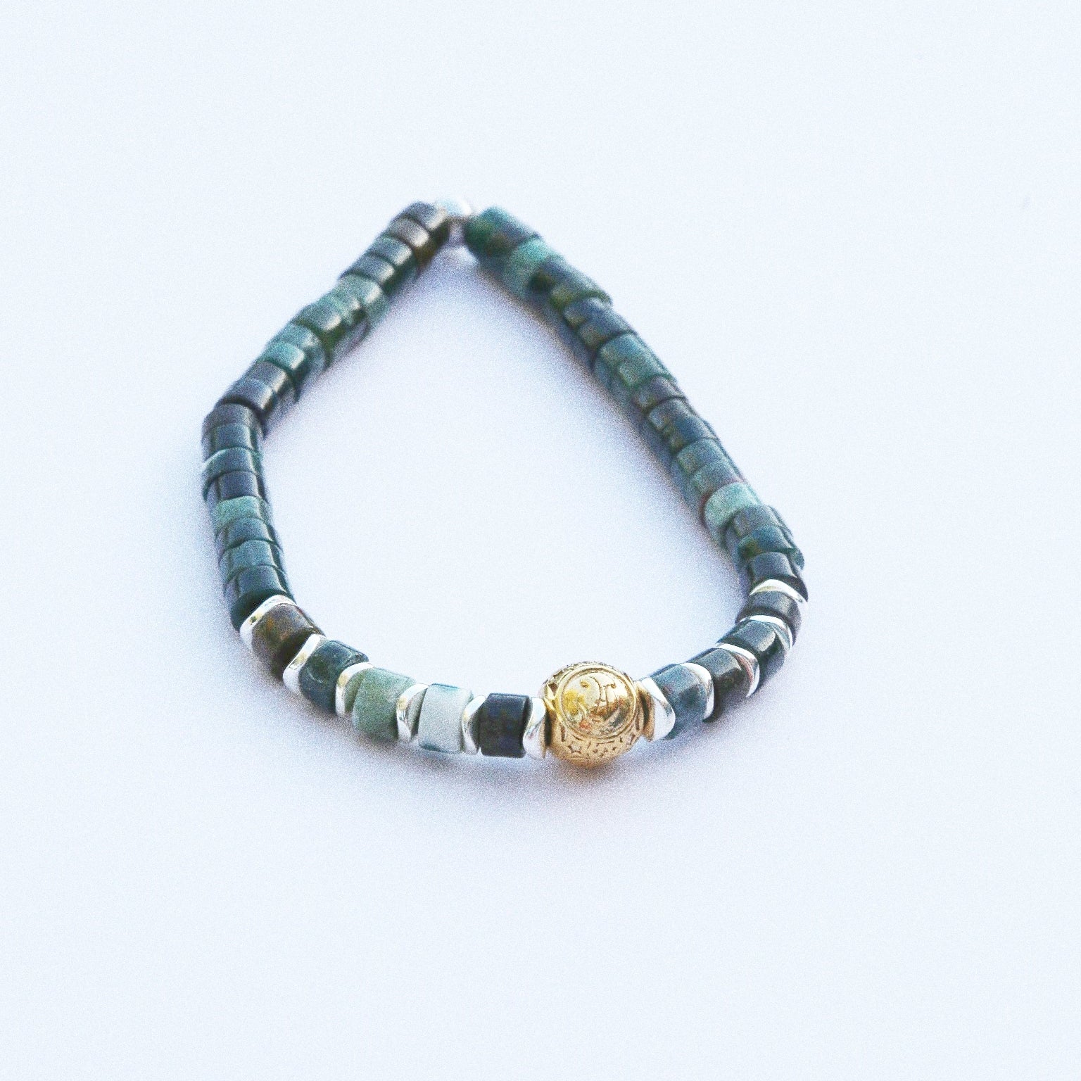 La perle centrale dorée sculptée du symbole de la vierge symbolise la lumière intérieure, la précision et la sagesse. Elle ajoute une touche masculine et raffinée, parfaitement en harmonie avec le style sobre et naturel du bracelet.