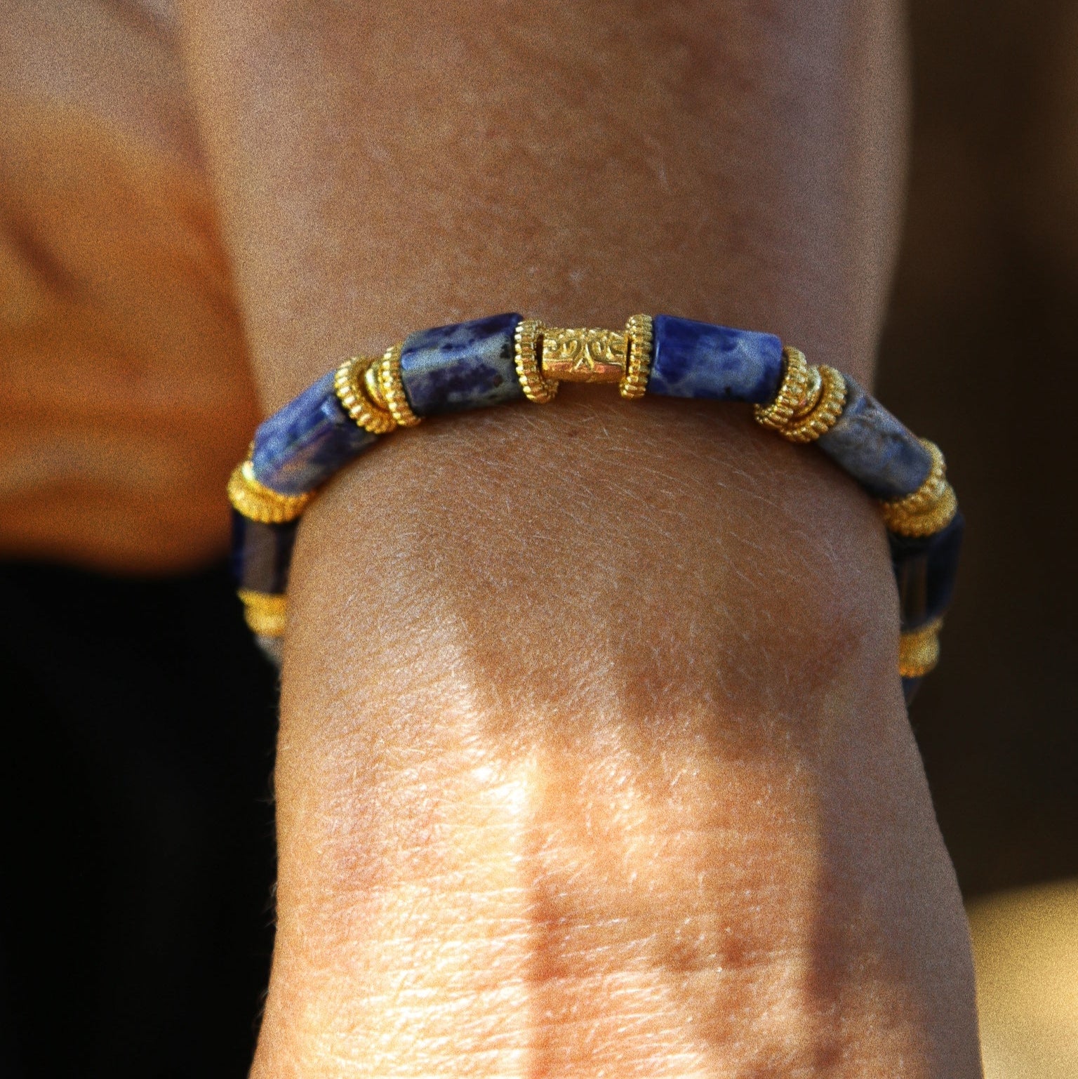 Il est composé de perles naturelles de sodalite, pierre qui stimule l’intuition, la communication et l’ouverture d’esprit, et sublimé par des perles dorées en 18k qui apportent éclat et élégance.