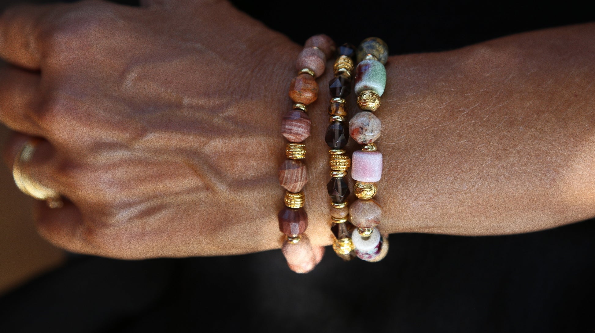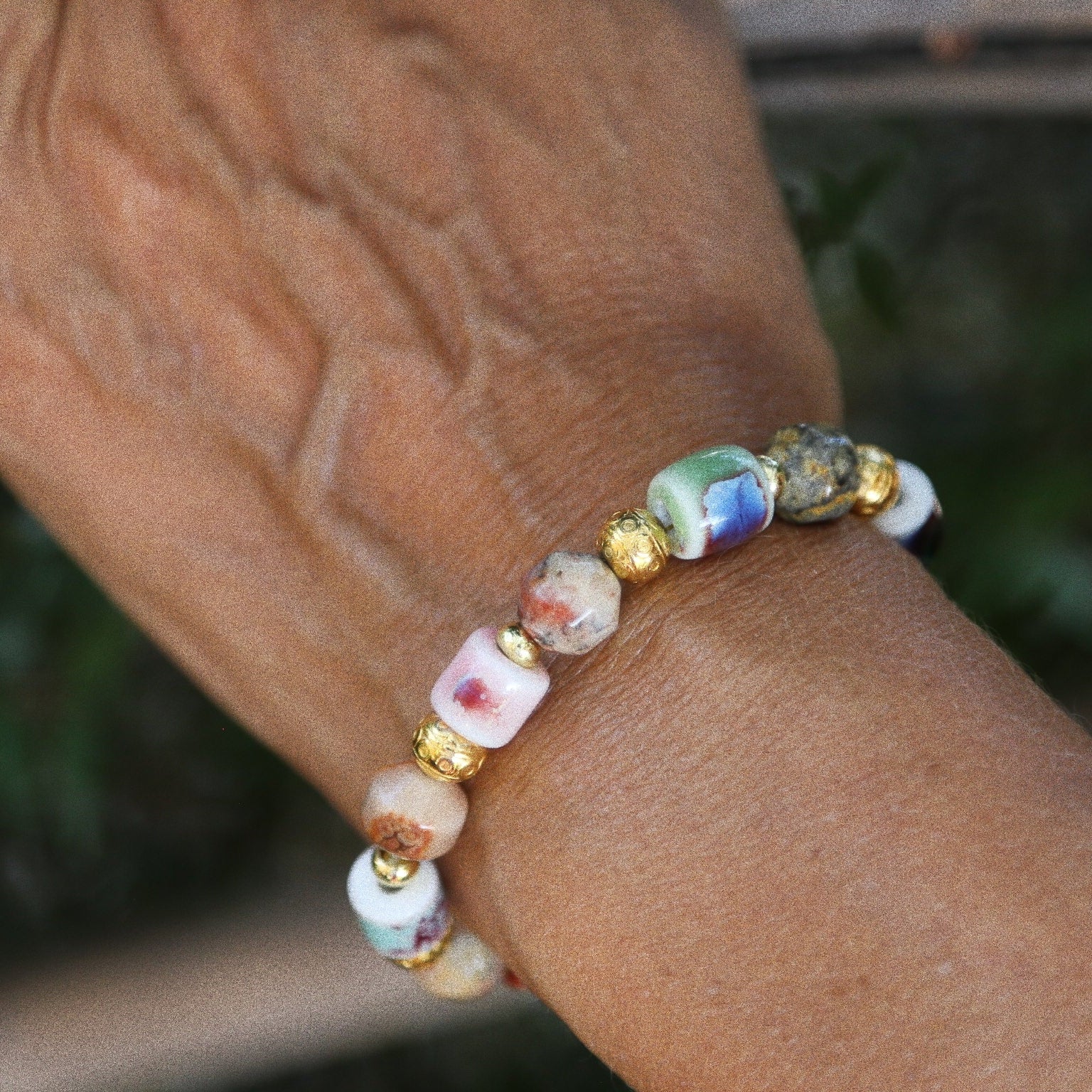 Il est composé de perles naturelles d’agate folle, pierre qui stimule la concentration, la vitalité et la créativité, associées à des perles en céramique pour une touche artisanale, et sublimé par des perles dorées en 18k qui apportent éclat et élégance.