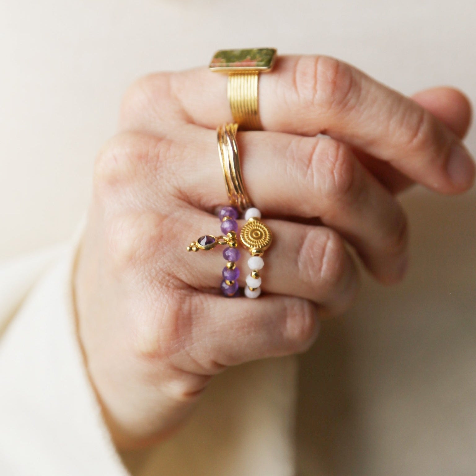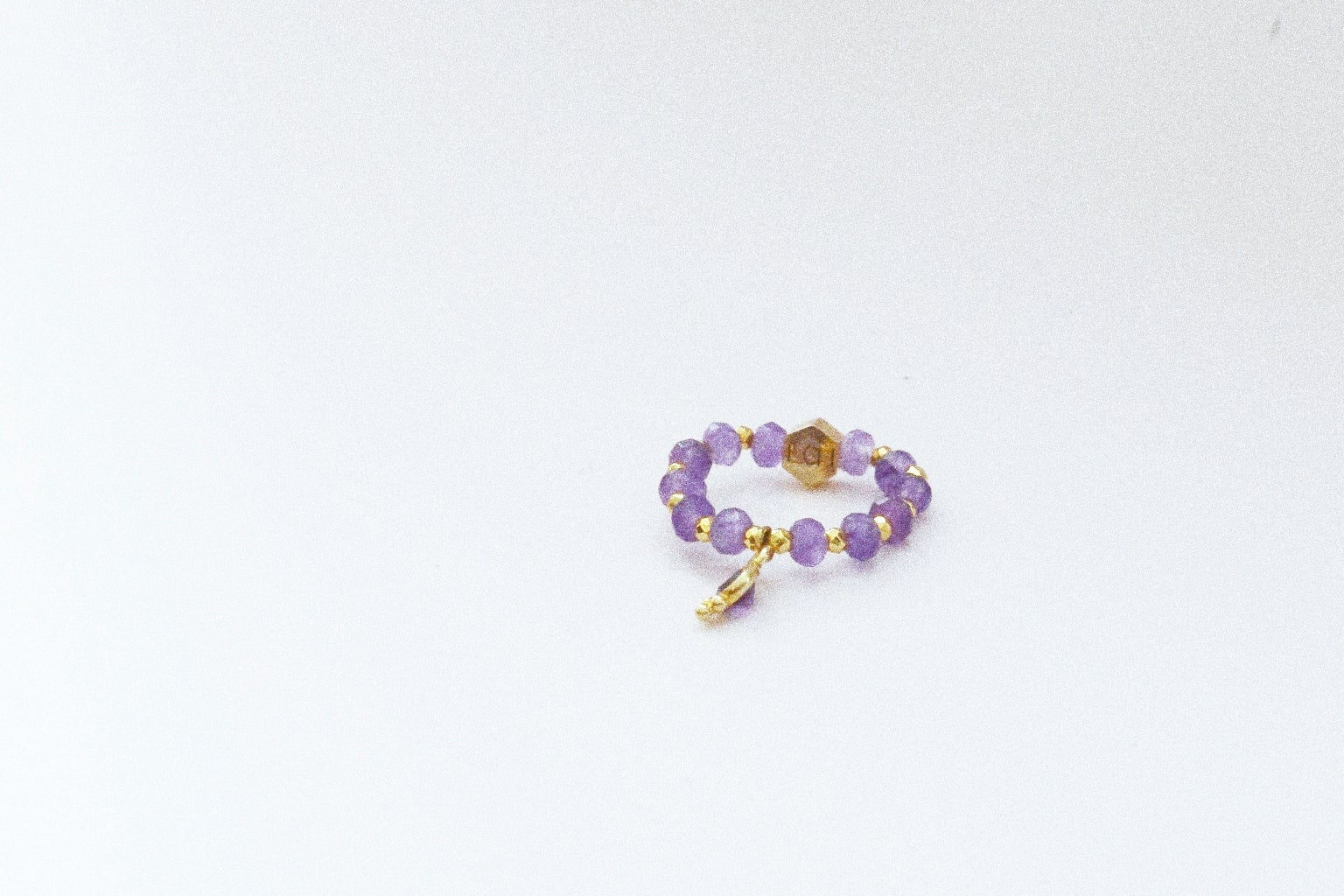 Délicate et lumineuse, cette bague en améthyste a été pensée comme un bijou de douceur, à porter chaque jour. Les perles violettes, symbole d’apaisement et de clarté intérieure, sont rehaussées d’un petit pendentif doré qui capte la lumière et apporte une touche précieuse sans jamais en faire trop.