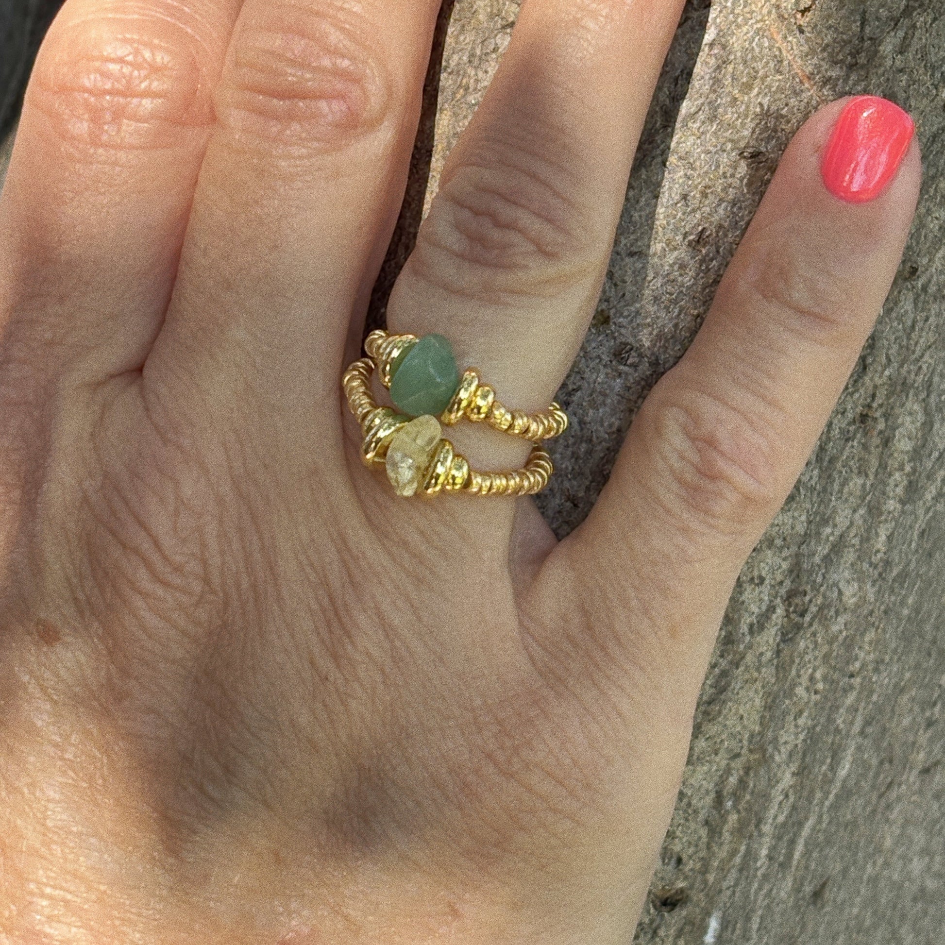 Cette bague délicate, entièrement fabriquée à la main dans mon atelier, associe la douceur du doré à la clarté d’un jaune éclatant.