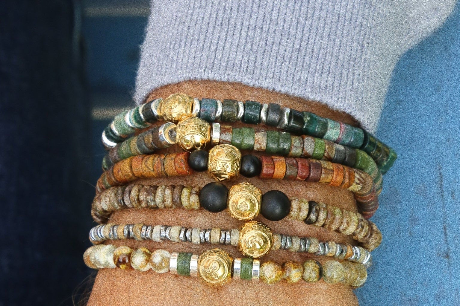 Composé de perles heishi dans des tons naturels gris, beige et pierre, ce bijou reflète la douceur et la profondeur émotionnelle du Cancer. Ces couleurs minérales symbolisent la stabilité, la tendresse et l'apaisement, trois forces essentielles pour ce signe d’eau.