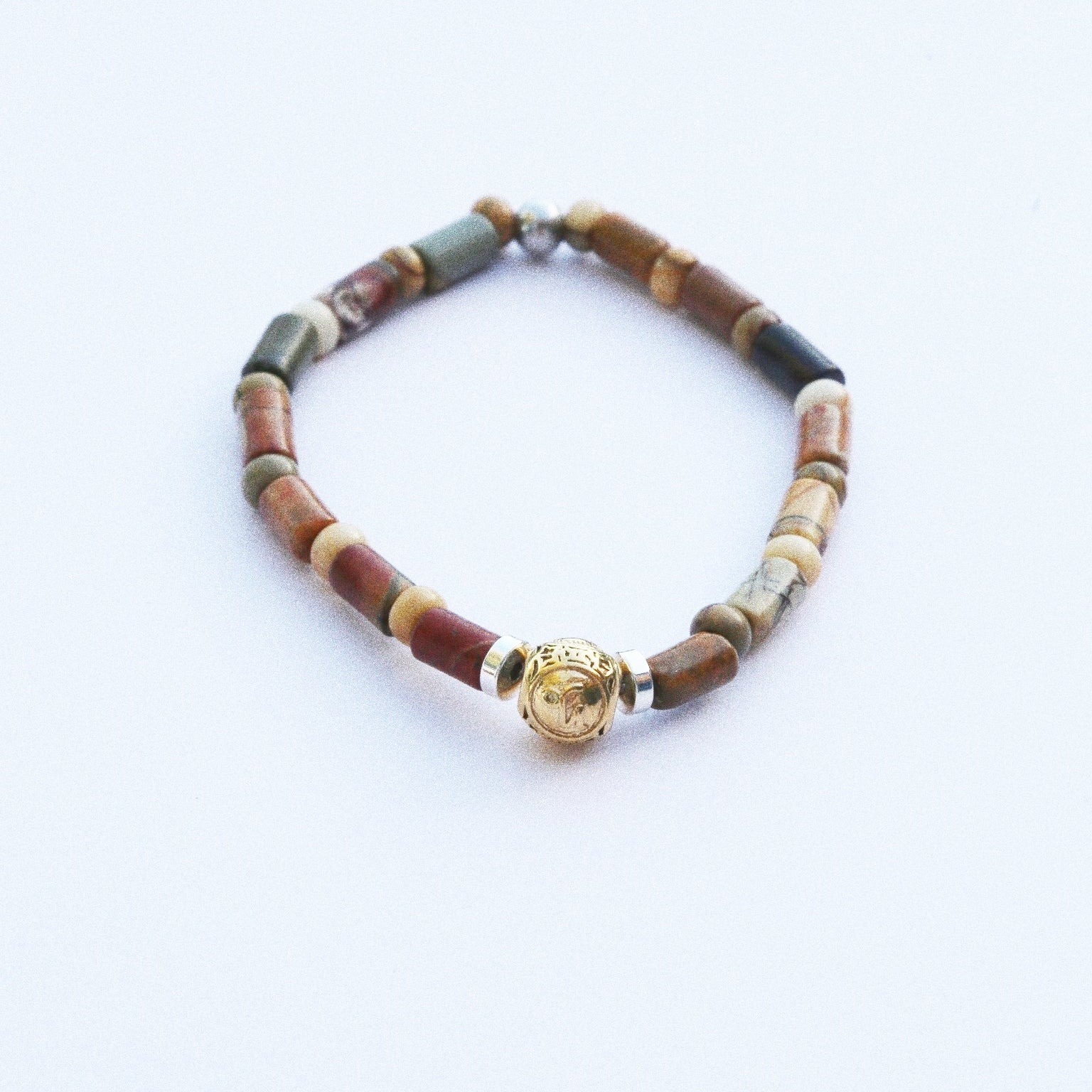 Les perles en jaspe impérial dévoilent une palette naturelle de beige, brun, terre et ocre, symboles de stabilité, de sagesse et de maturité.