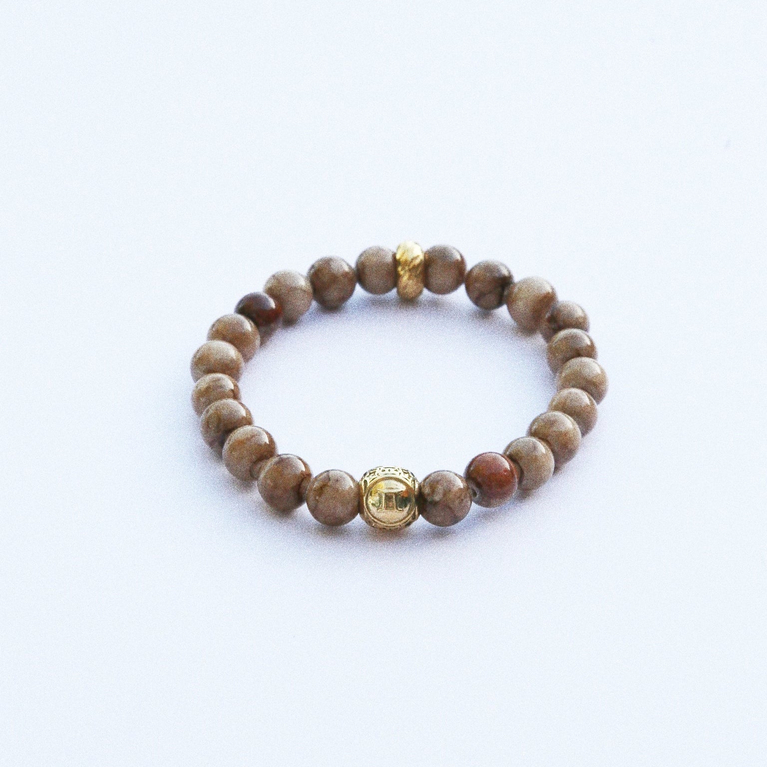 Les perles rondes en jaspe picture, aux nuances terre et sable, apportent stabilité, apaisement mental et ancrage léger.