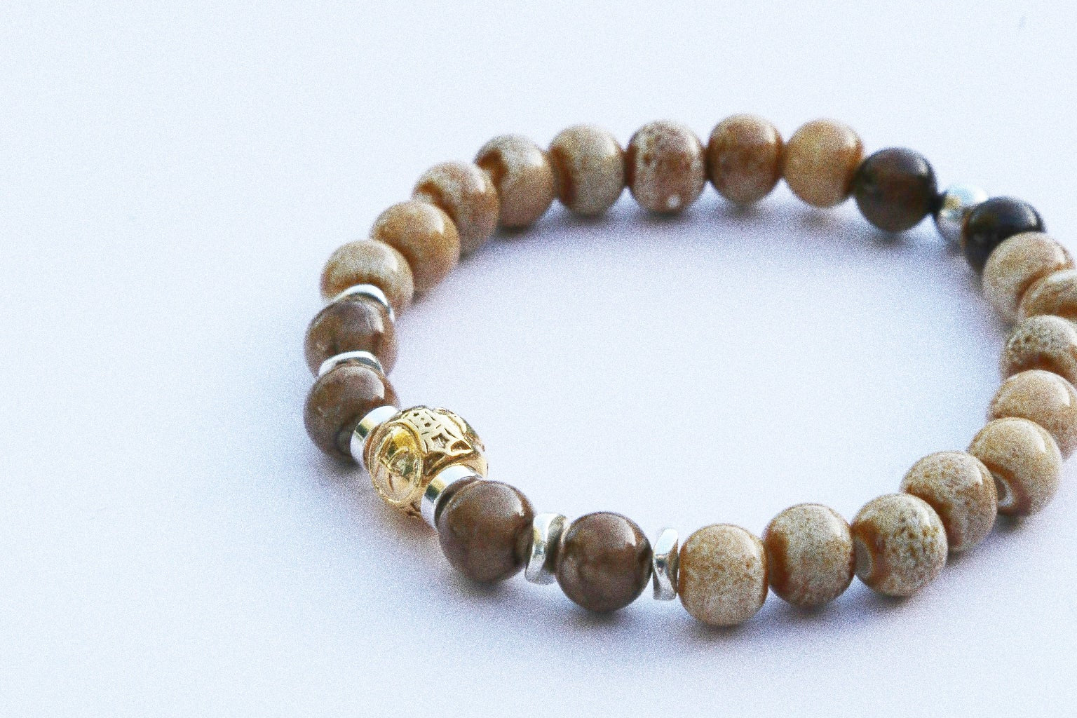 Composé de perles rondes en jaspe océan, aux nuances sable, crème et bruns doux, ce bracelet apporte calme, introspection et harmonie intérieure.
