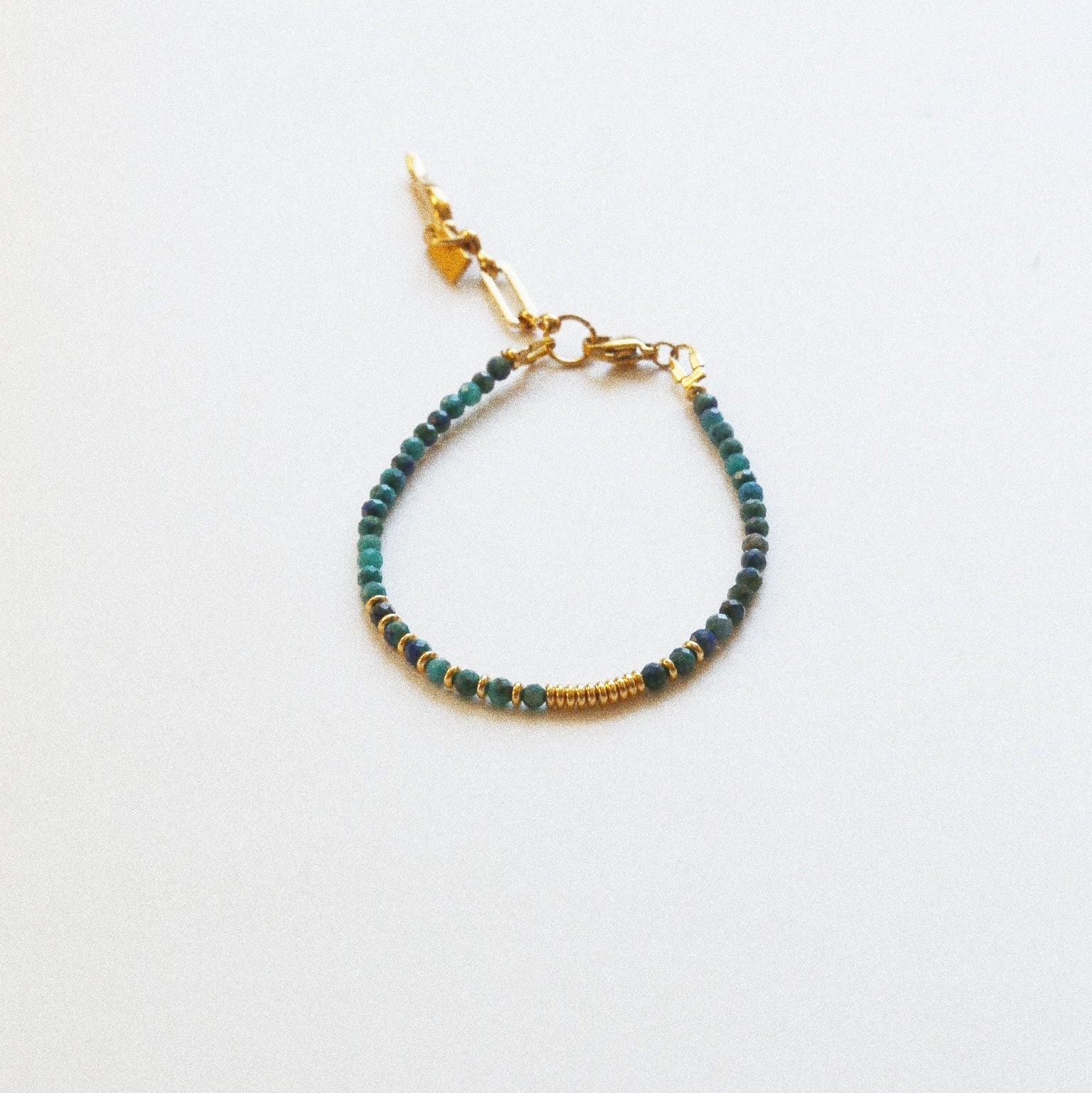 ✨ Composition : Chrysocolle et petites perles dorées plaquées or 18k, corne porte-bonheur