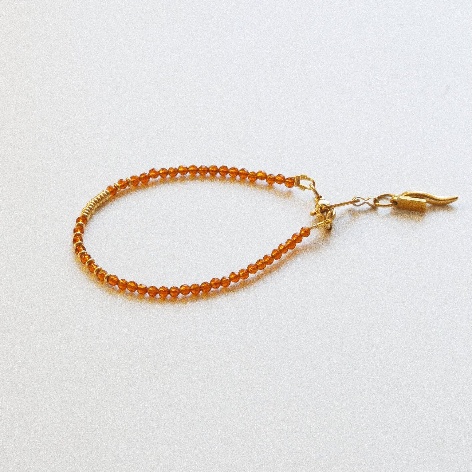 ✨ Composition : Perles de verre couleur miel et petites perles dorées plaquées or 18k, corne porte-bonheur