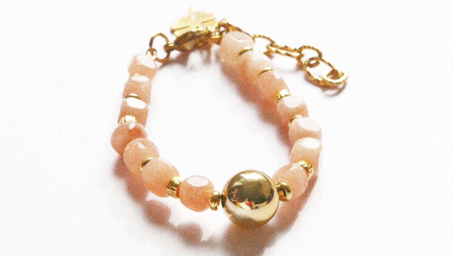 Bracelet – Calcédoine Rose, Perles Dorées & Trèfle