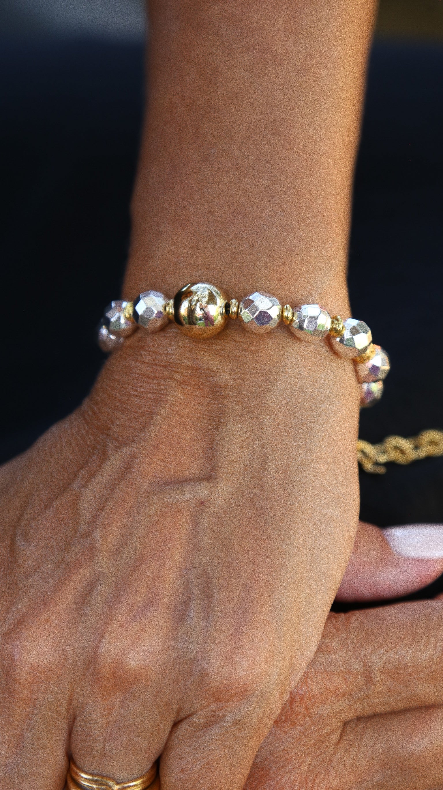 Bracelet – Perles Argent Disco, Grosse Perle Dorée & Carpe