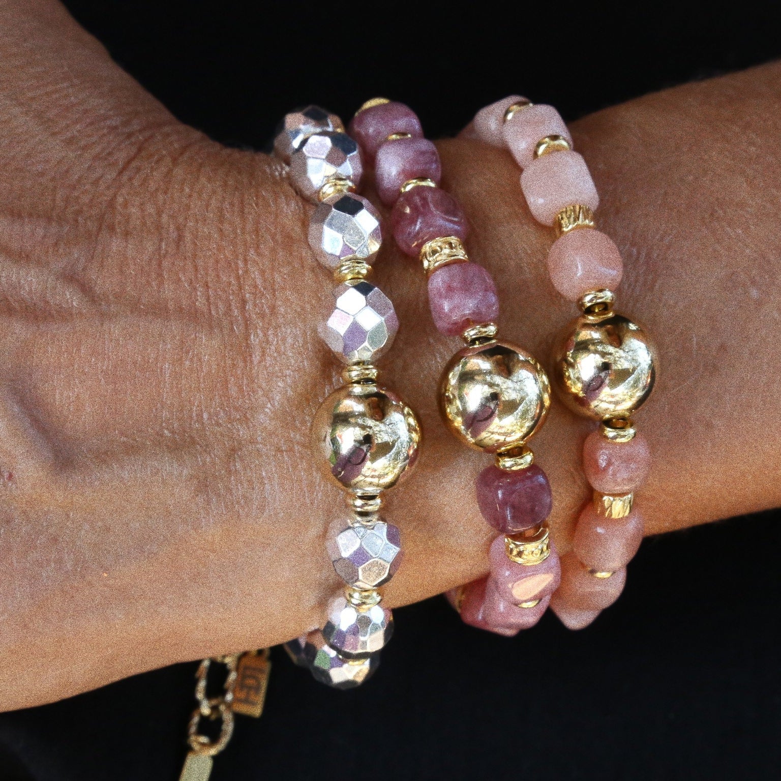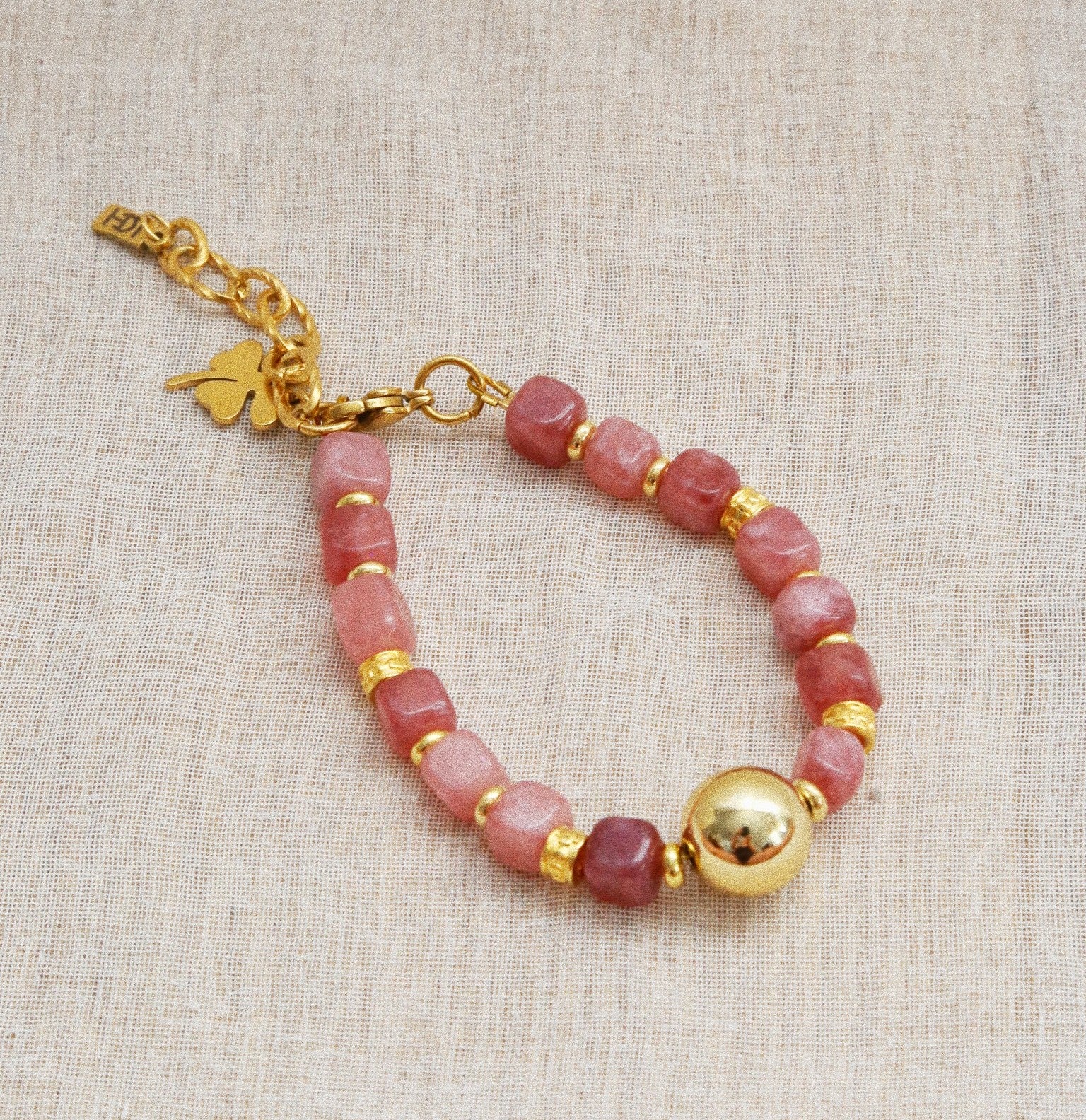 Bracelet – Quartz Fraise, Perles Dorées & Trèfle