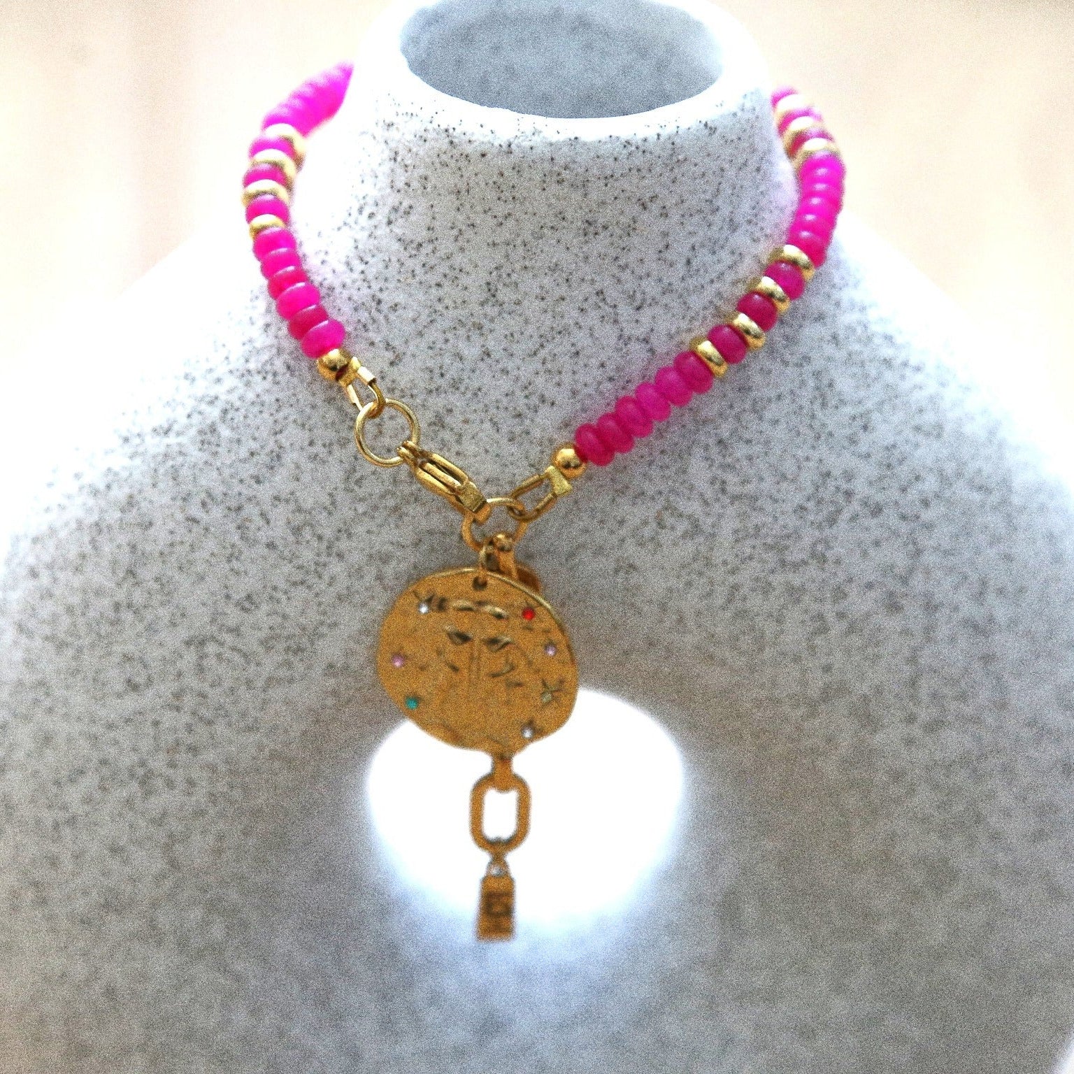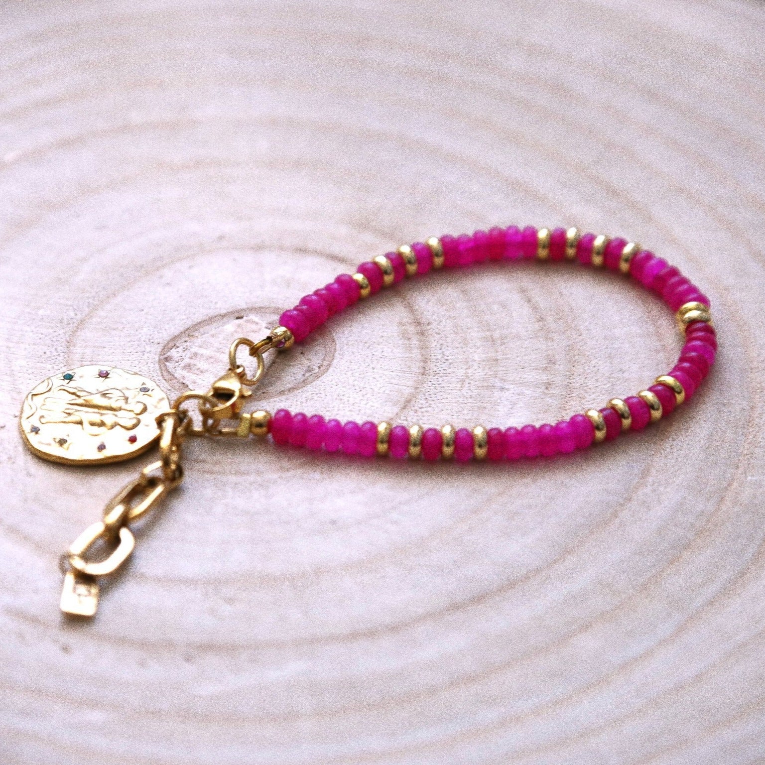 Bracelet Talisman en Agate Fuchsia – Médaille Gémeaux