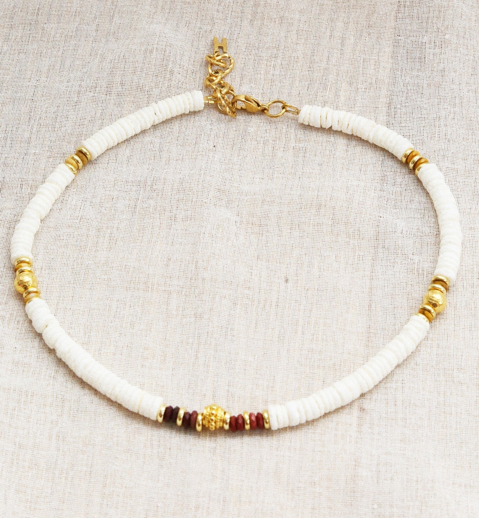 Apportez charme naturel et élégance bohème à vos tenues avec ce collier en perles de coquillage blanc et mookaite, sublimé par des perles dorées en 18k . La mookaite est reconnue pour apporter énergie, équilibre et protection, faisant de ce bijou un véritable talisman du quotidien.