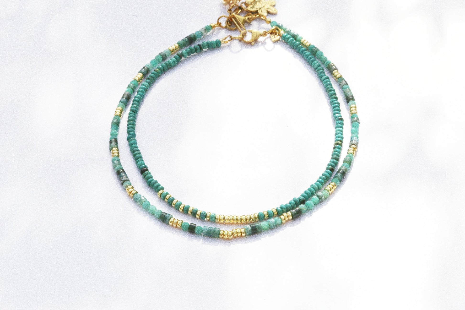 Ce collier délicat est composé de pierres naturelles aux nuances vert d’eau, associées à des perles dorées et sublimé par une fleur en plaqué or, symbole de renouveau, de féminité et d’épanouissement.