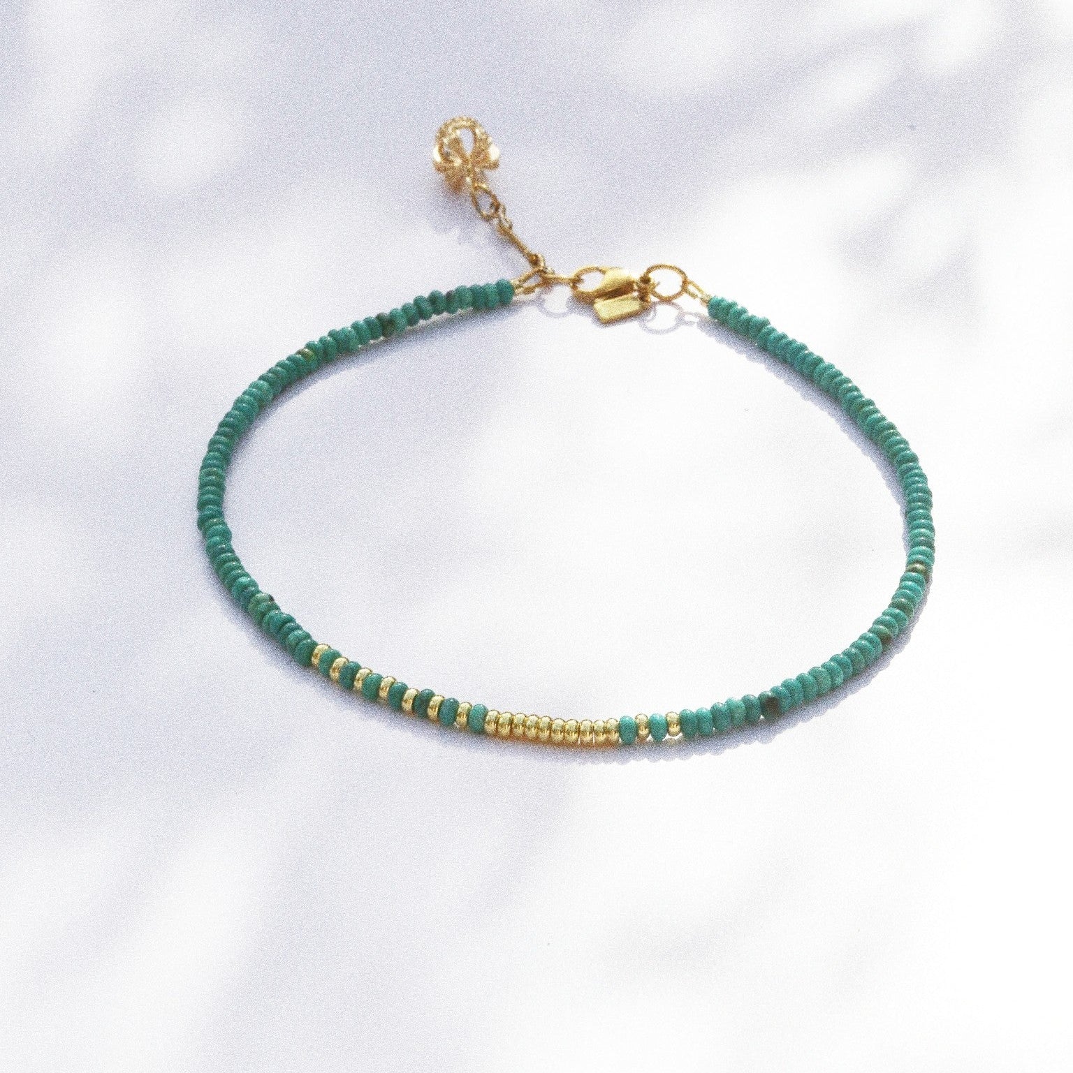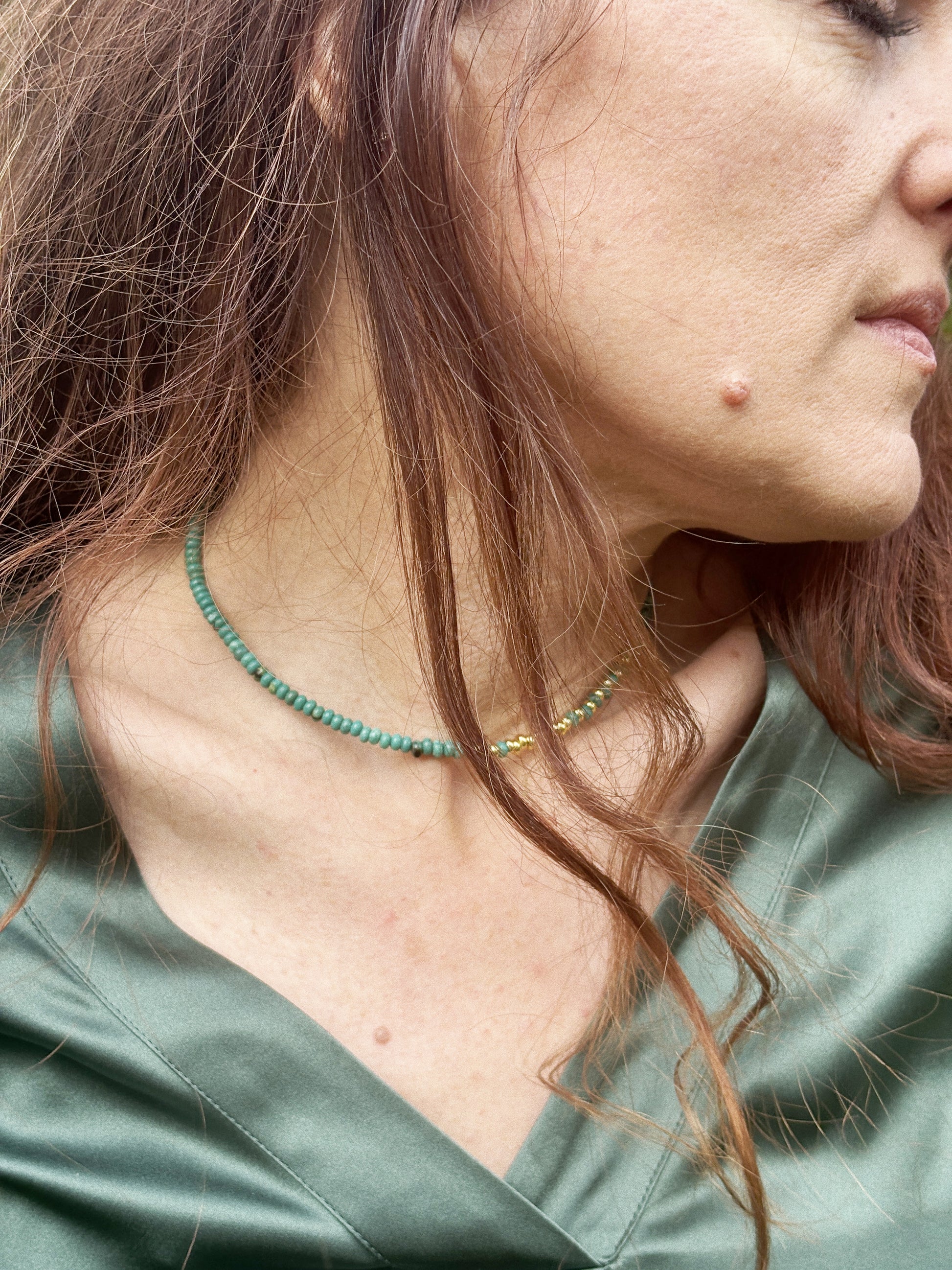 Ce collier délicat est composé de turquoise, une pierre de protection et de communication, reconnue pour apaiser les émotions, renforcer la confiance en soi et favoriser l’expression authentique. Associée depuis toujours aux voyages et à la liberté, la turquoise accompagne celles qui souhaitent avancer avec sincérité, courage et ouverture du cœur.