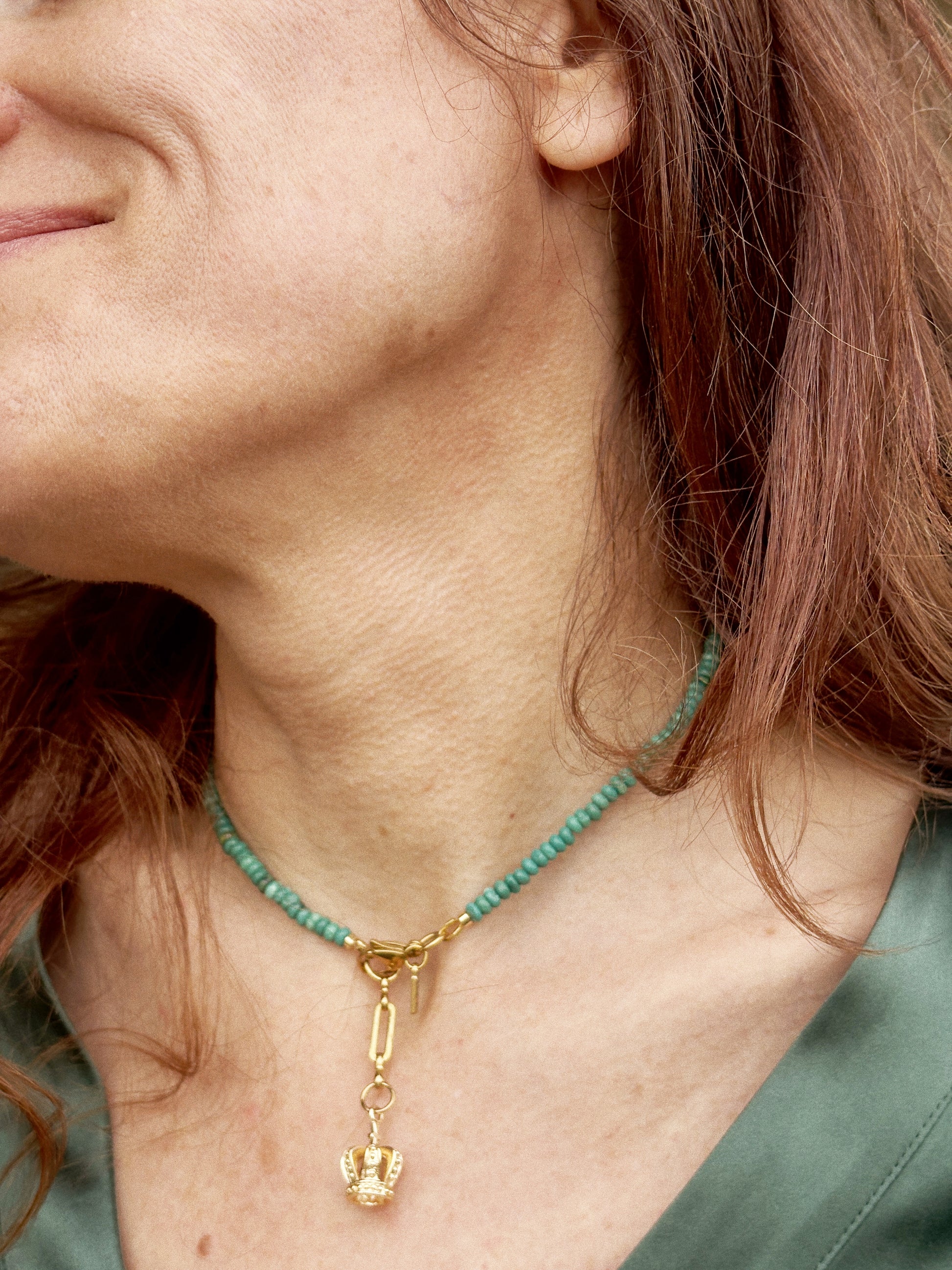 Les perles sont ponctuées de détails dorés et sublimées par une couronne dorée en 18k, symbole de souveraineté intérieure, de force féminine et d’affirmation de soi.