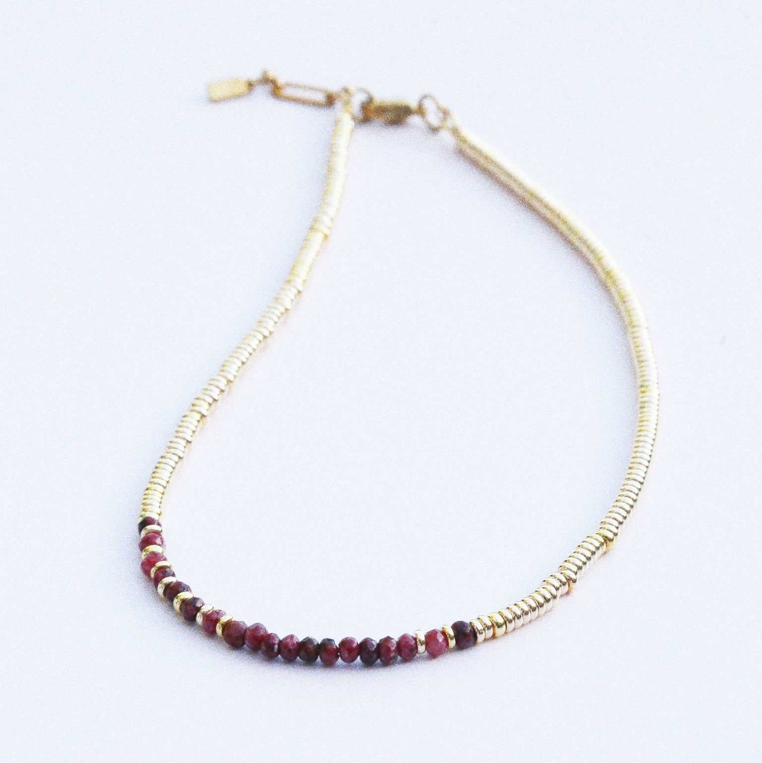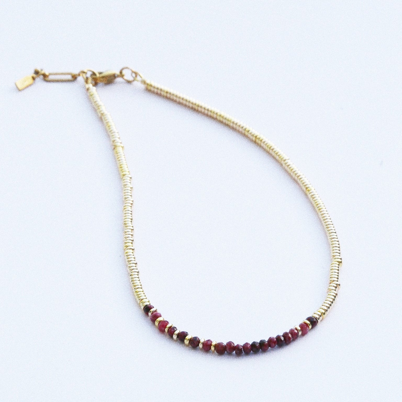 Ce collier est composé de perles facettées rouge profond et de perles dorées 18k, créant un contraste vibrant et élégant.