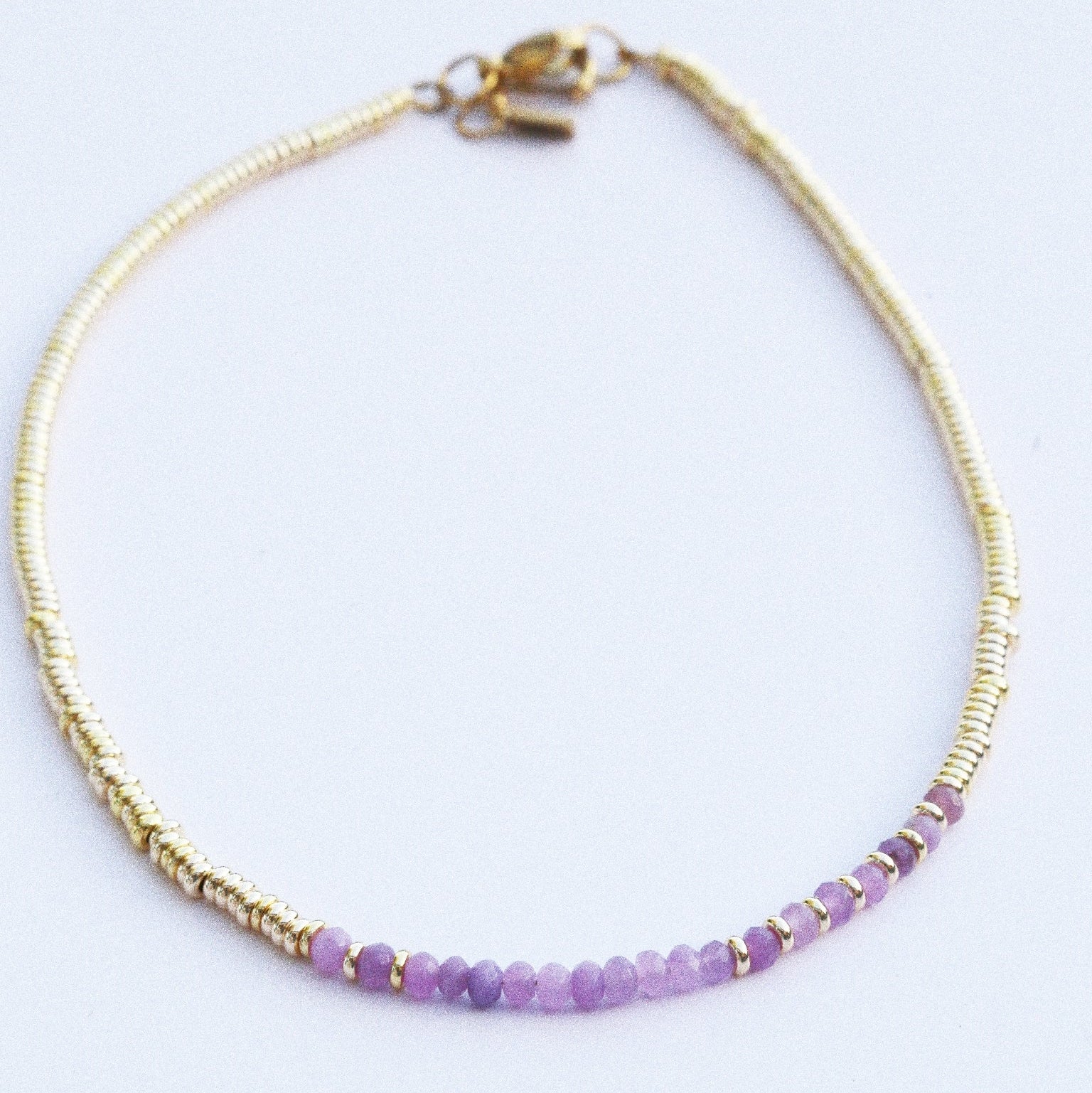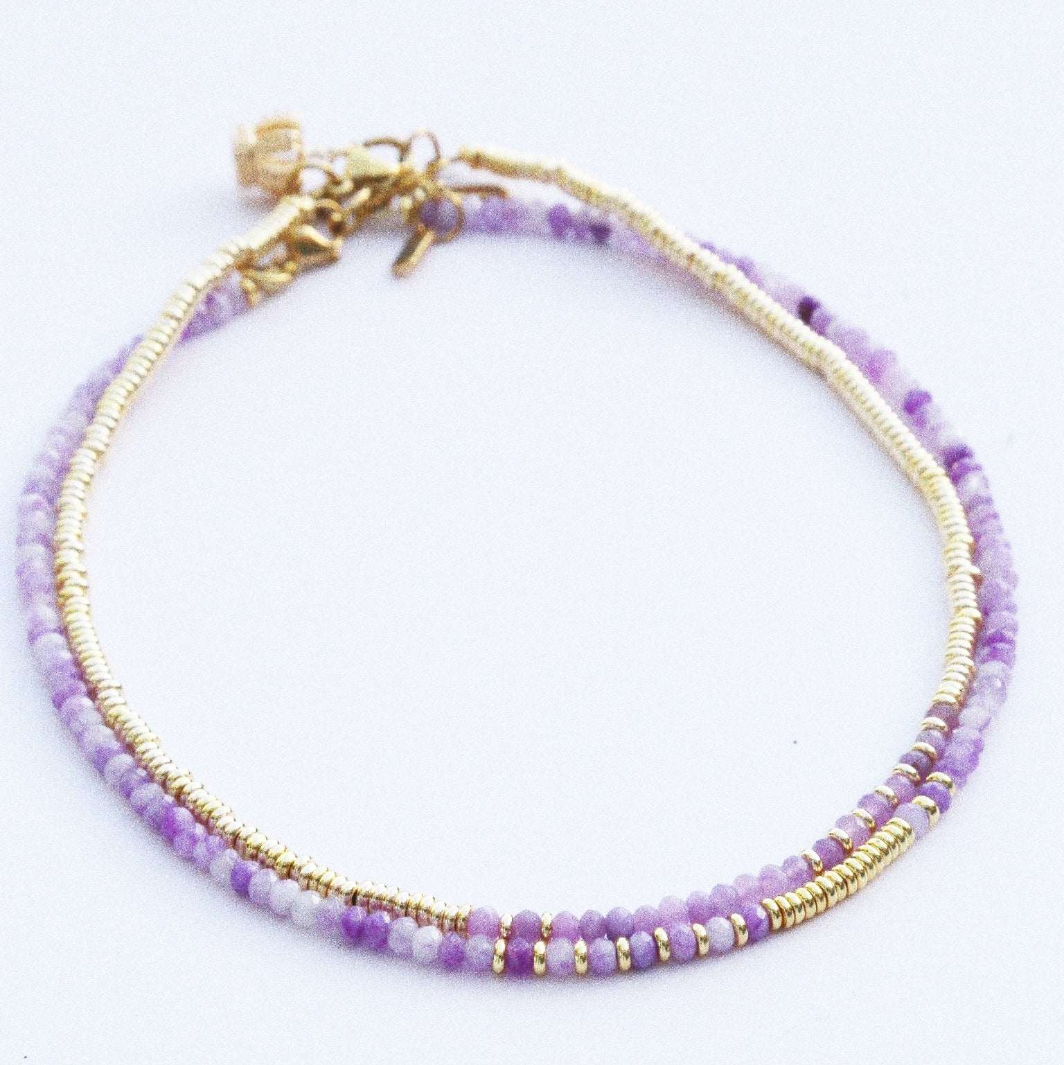 Ce collier associe des perles facettées violettes à l’éclat rayonnant des perles dorées 18k.