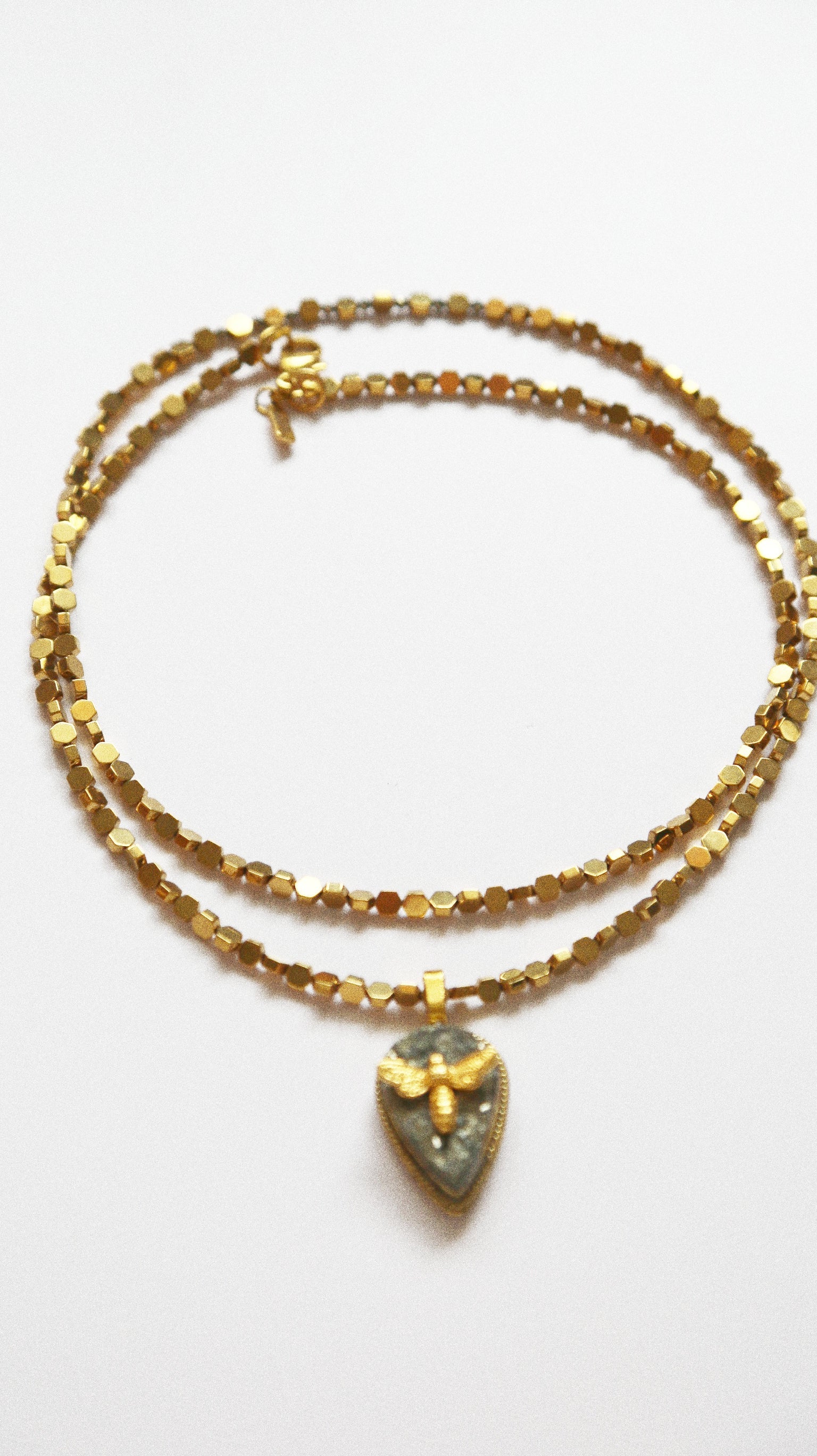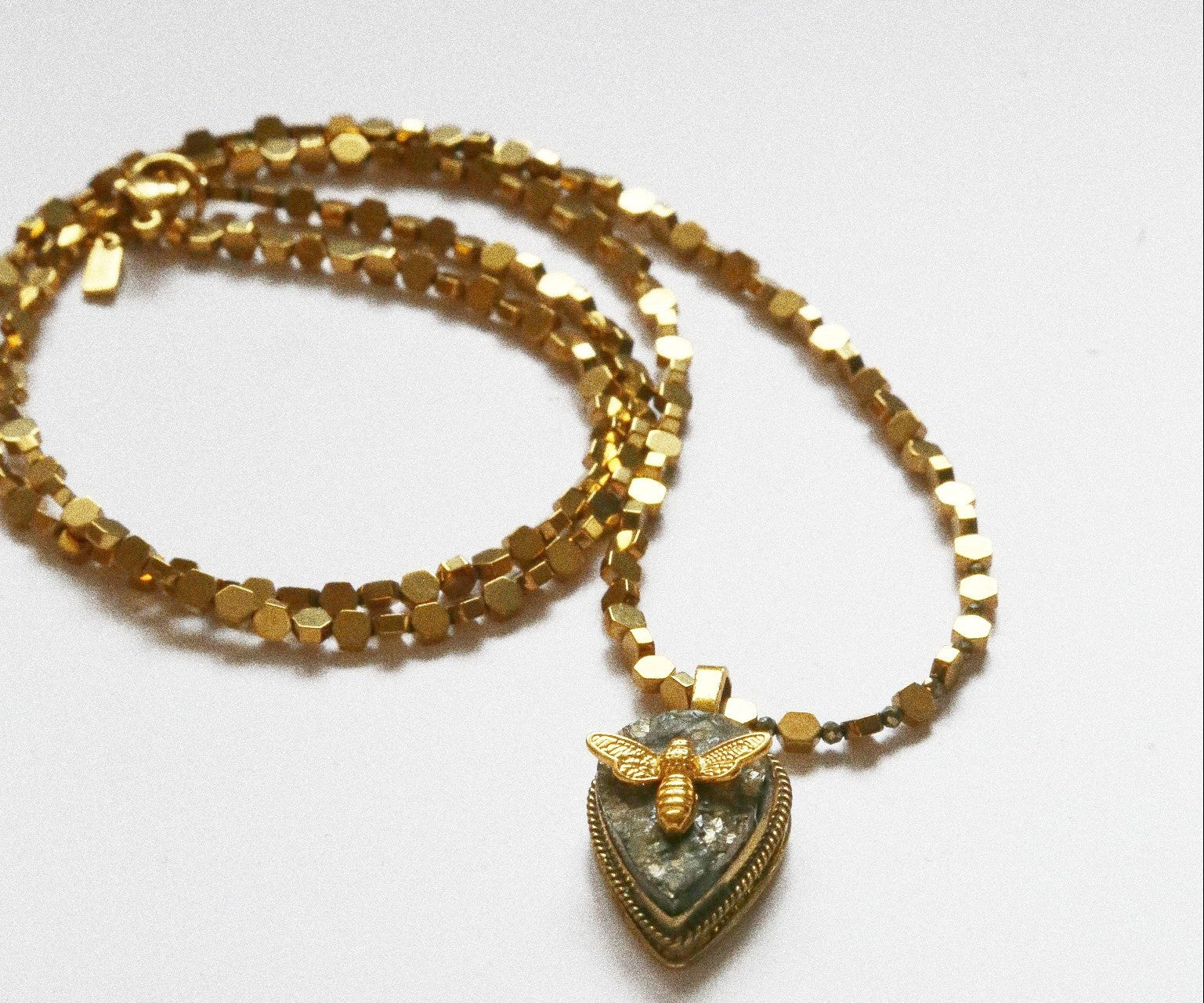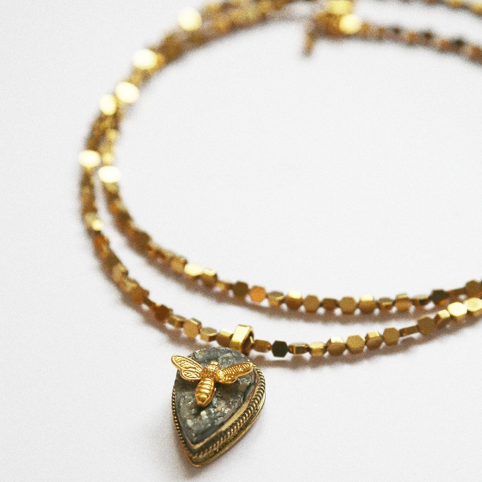 Au centre, un pendentif en pyrite orné d’une abeille en plaqué or vient sublimer la pièce.