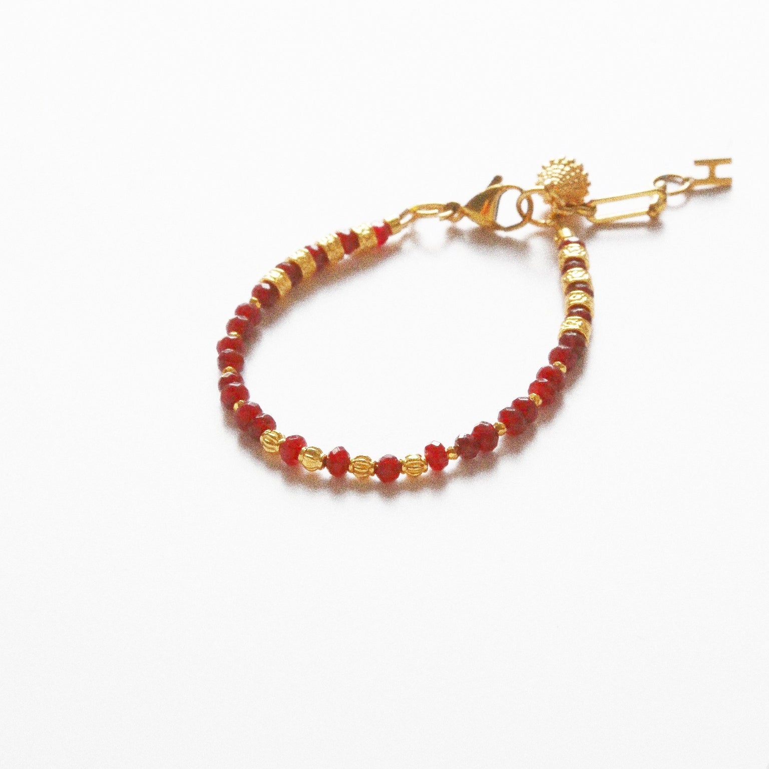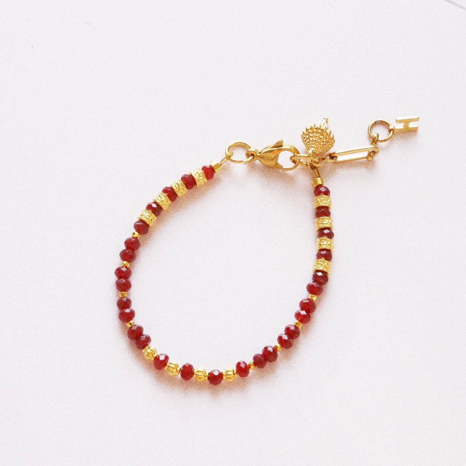 ❤️ Bracelet Henriette – Grenat, Perles Dorées 18k & Charm Toupie