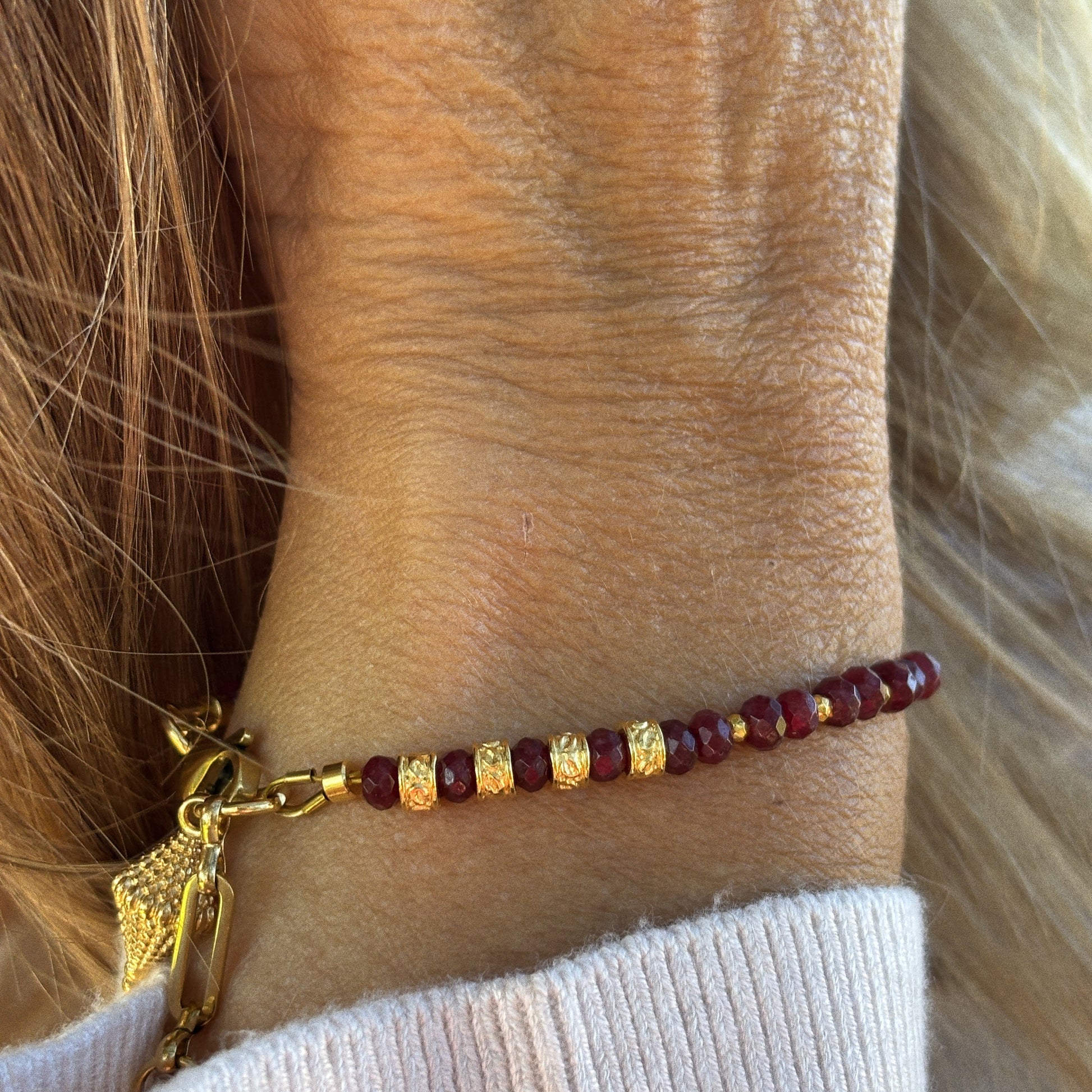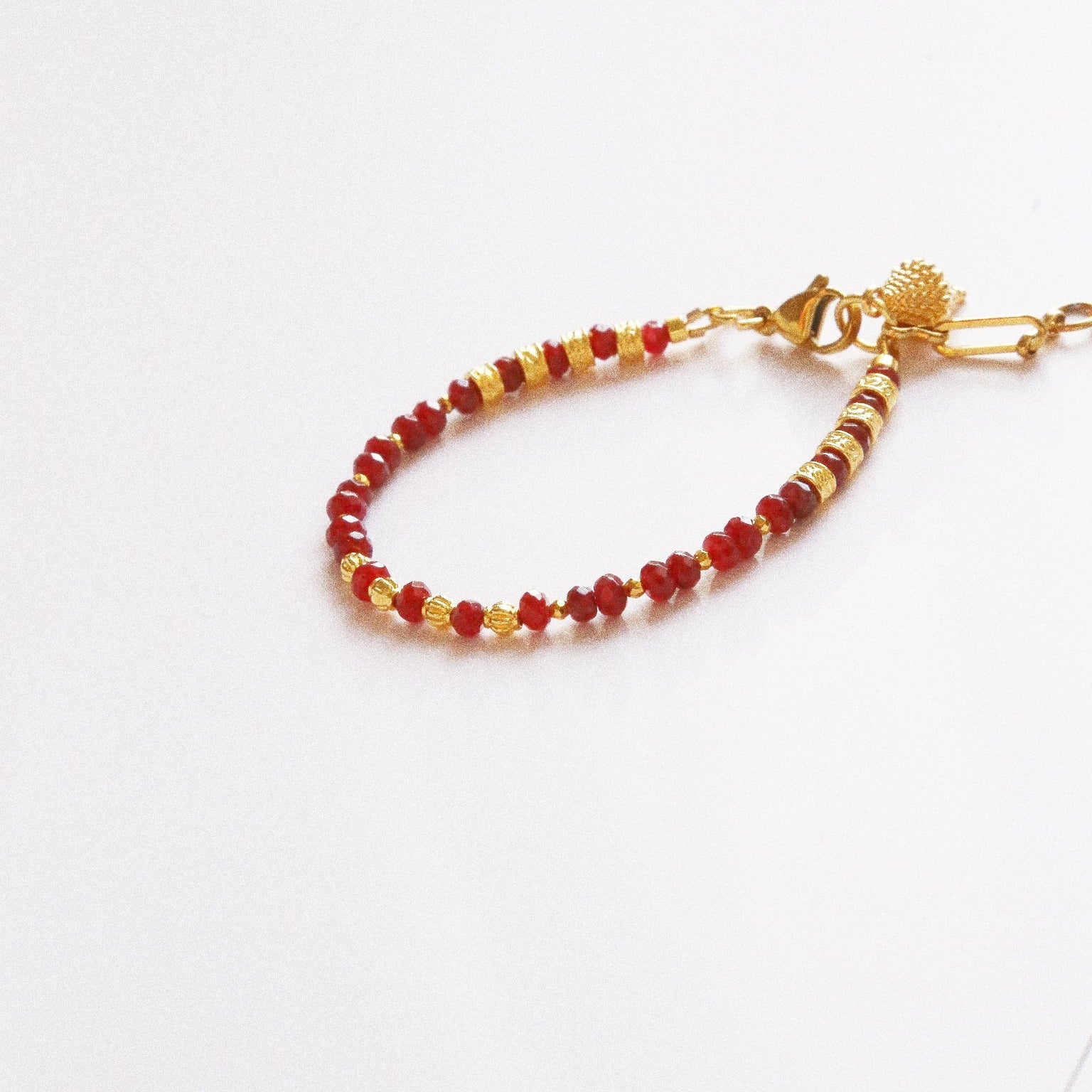 Composé de perles de grenat profond, de perles dorées plaquées 18k et de délicates perles Miyuki dorées, il mêle élégance, éclat et symbolisme dans un équilibre parfait.