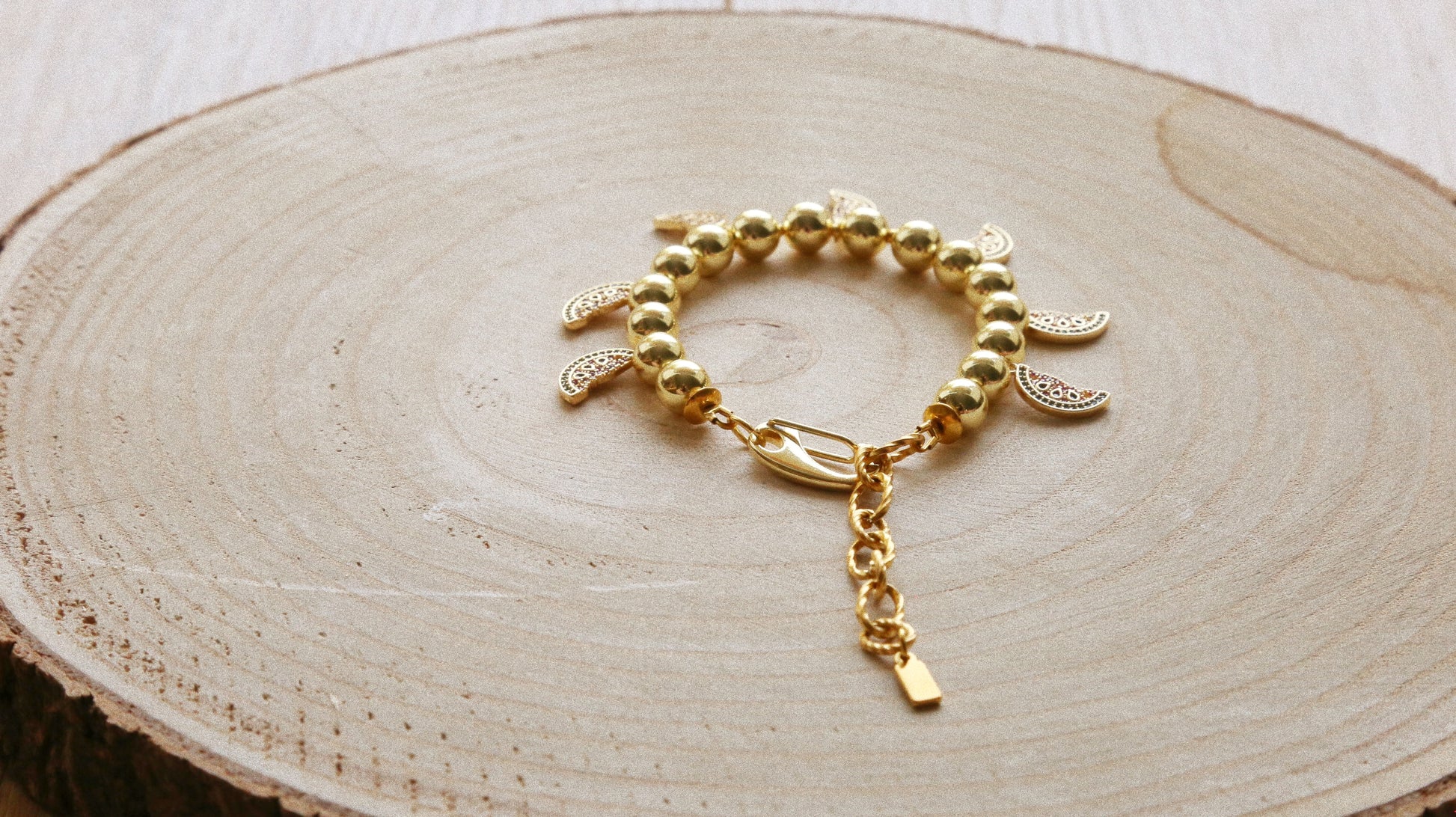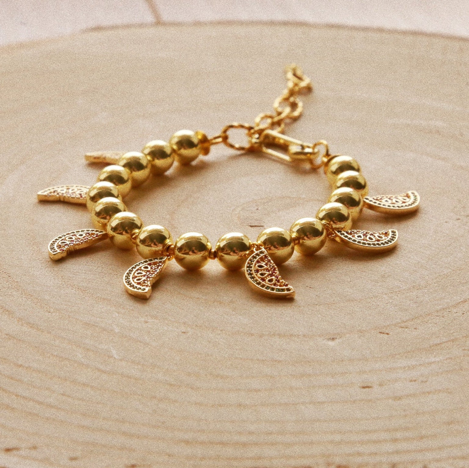 Ce bijou est composé de perles dorées lumineuses qui captent la lumière à chaque mouvement, et de charms pastèques en plaqué or 14k, délicatement détaillés, pour une touche sucrée et espiègle. Une combinaison parfaite entre élégance et fraîcheur estivale.