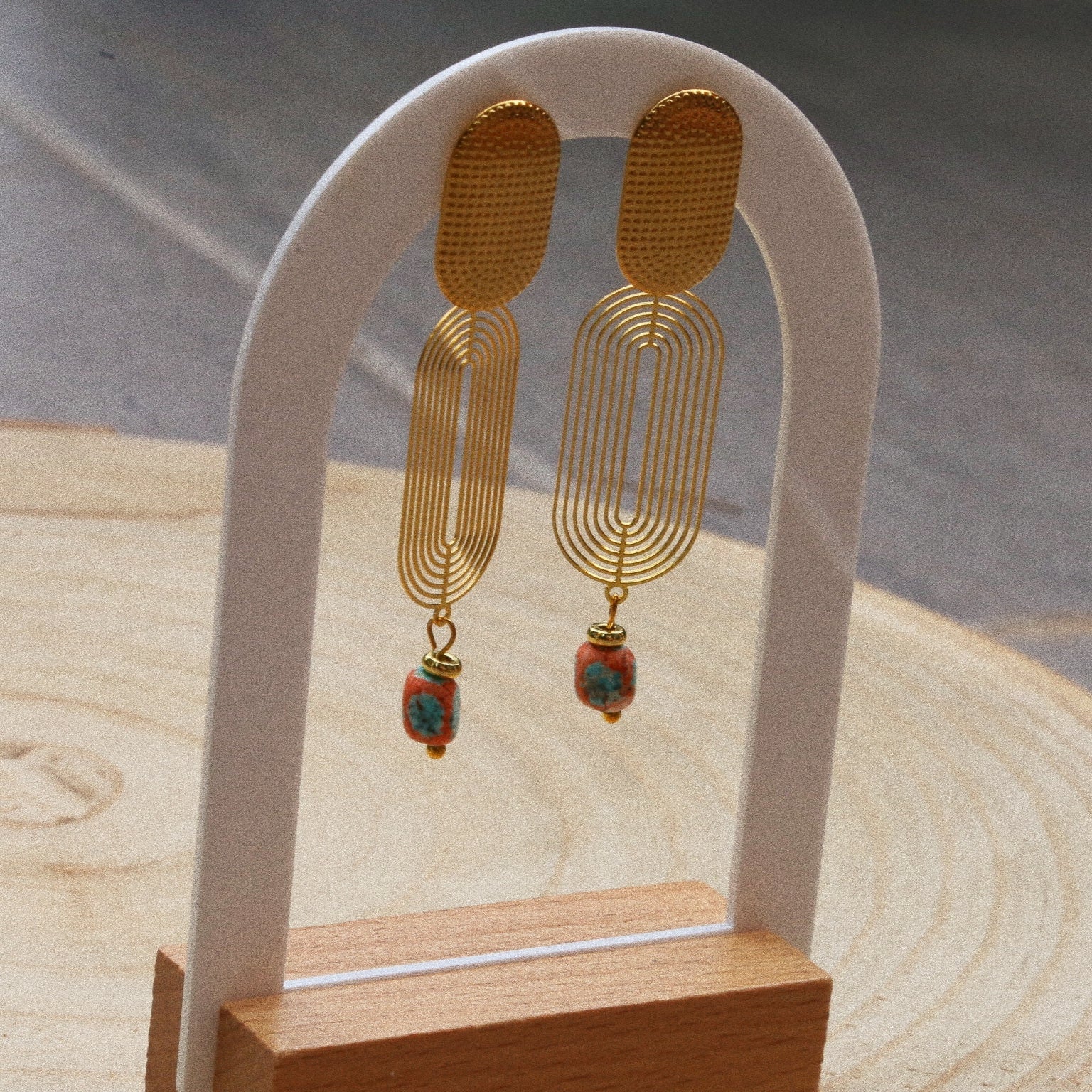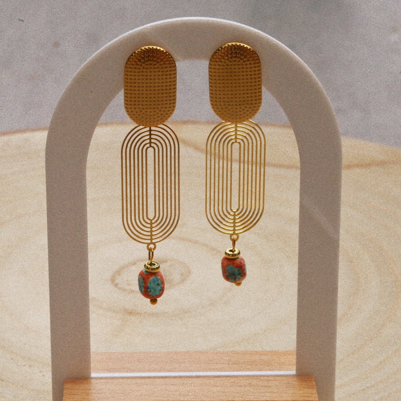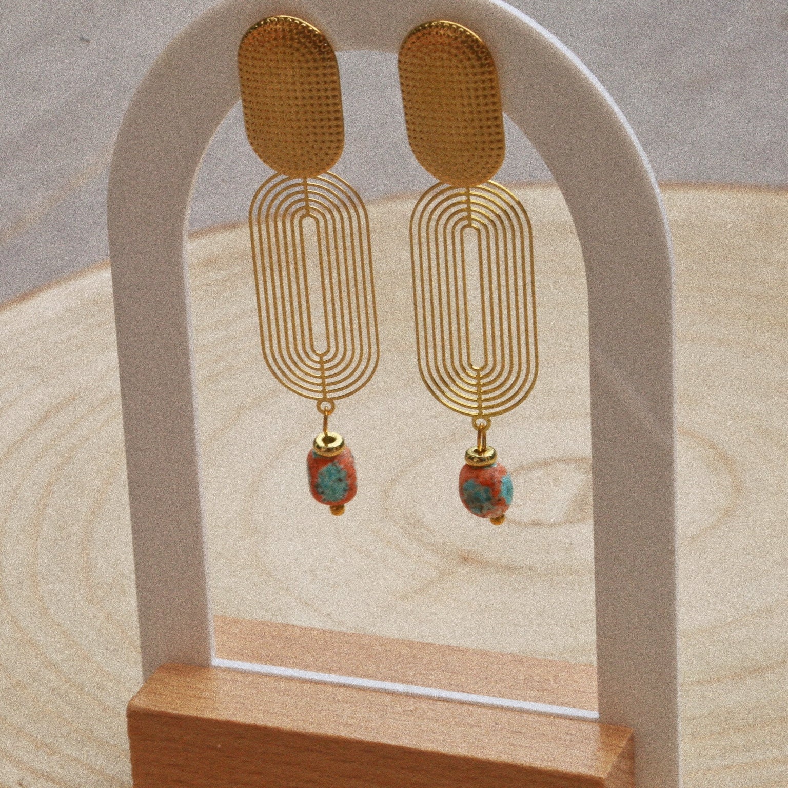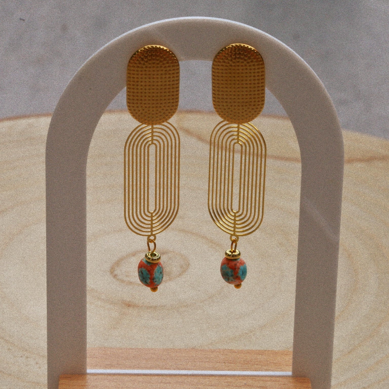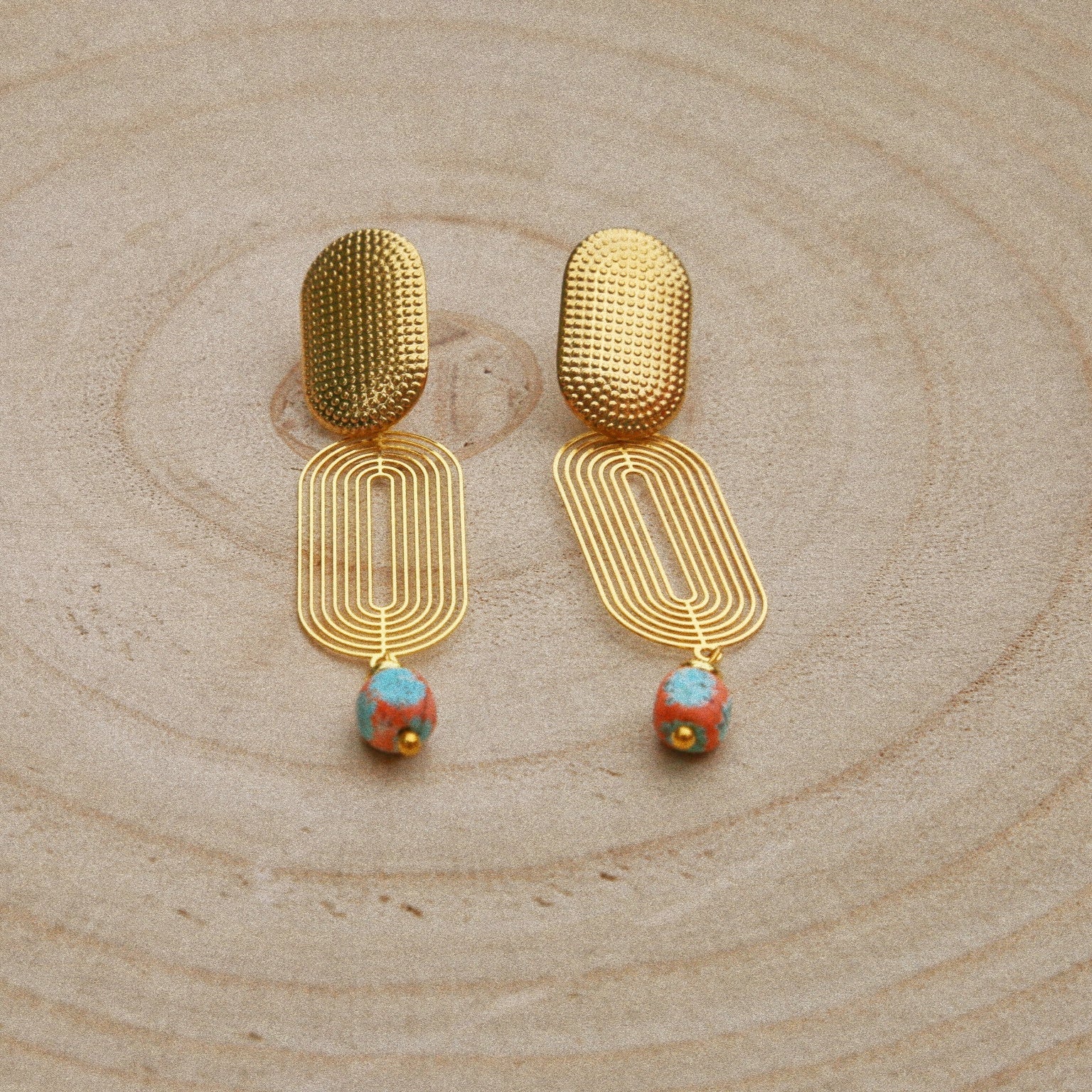 Ajoutez une touche de soleil et d’élégance à vos looks avec ces boucles d’oreilles bohèmes sur tige en acier inoxydable doré, ornées de perles en céramique turquoise et terracotta.