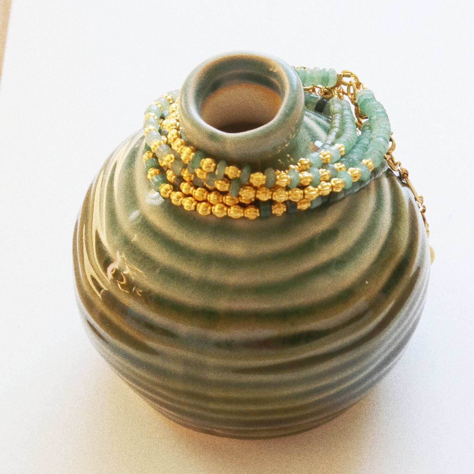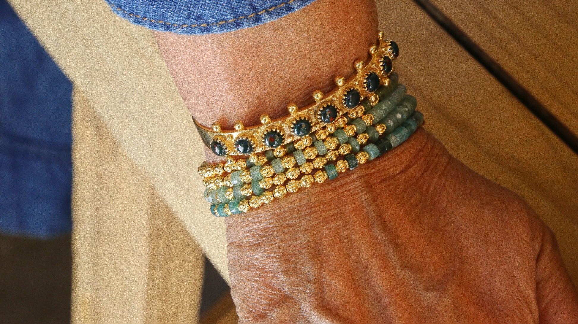 Les perles en forme de soucoupe ajoutent une touche originale et graphique, tandis que l’alliance du vert profond et du doré lumineux crée un bijou bohème chic, à porter seul ou en accumulation pour un effet encore plus raffiné.