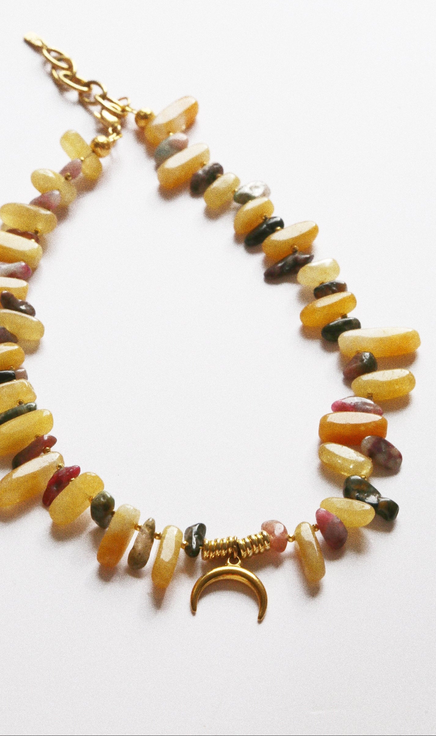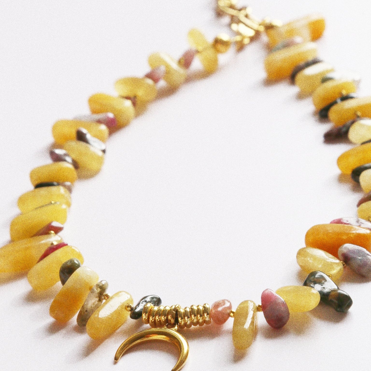 Apportez couleur, énergie et élégance bohème à vos tenues avec ce collier en perles longues d’agate aux teintes jaune, violette, grise et verte, sublimé par des perles dorées en 18k et des pendentifs folk délicatement travaillés. Les agates sont des pierres favorisant l’équilibre, la protection et la force intérieure, transformant ce bijou en talisman quotidien.
