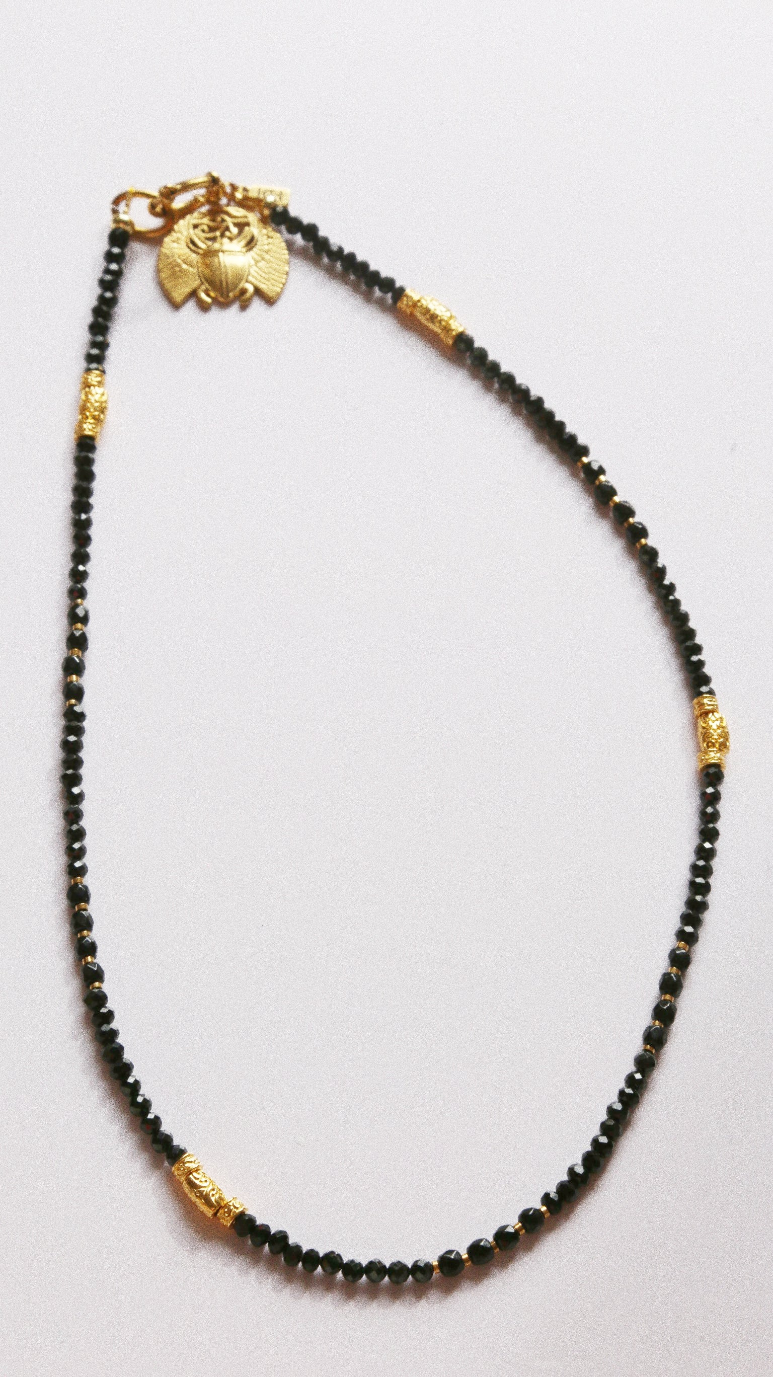 Matériaux : agate noire naturelle (tailles variées), perles dorées 18k, pendentif scarabée bohème