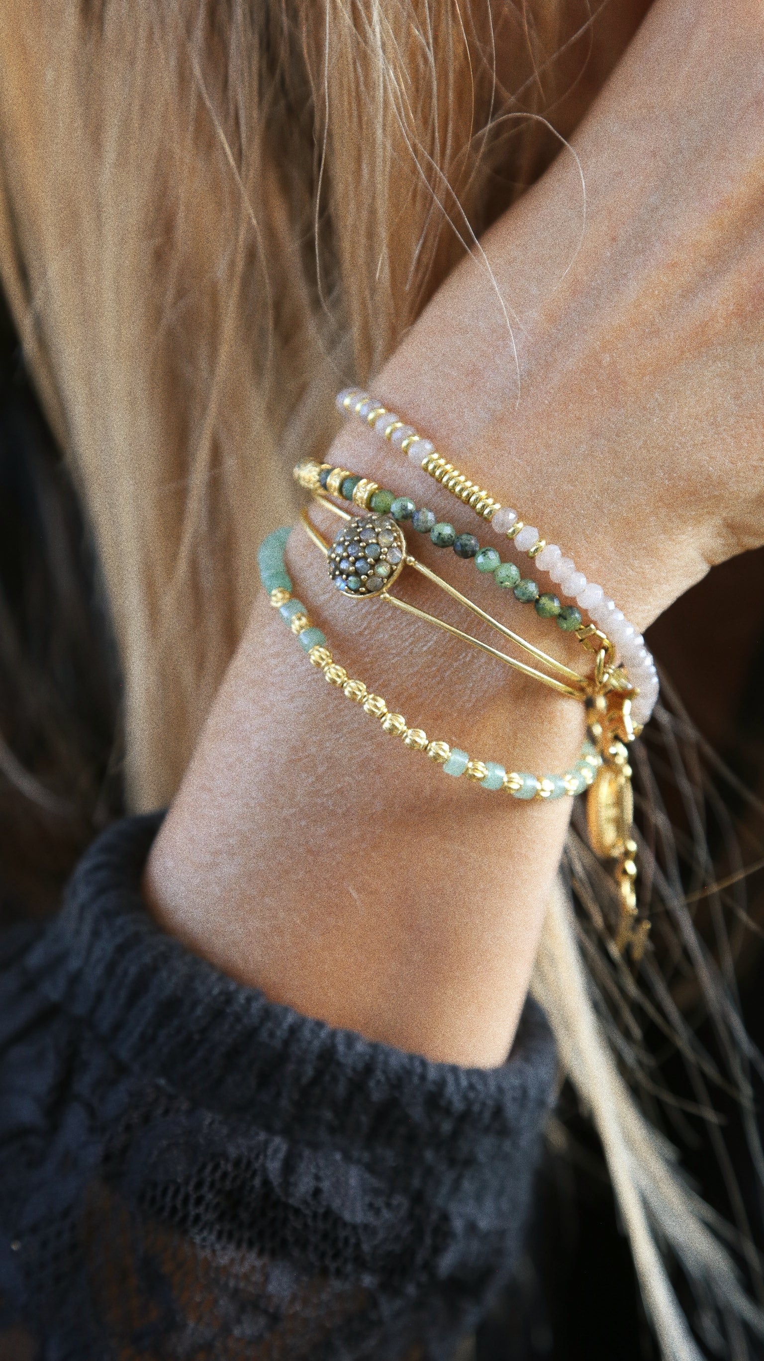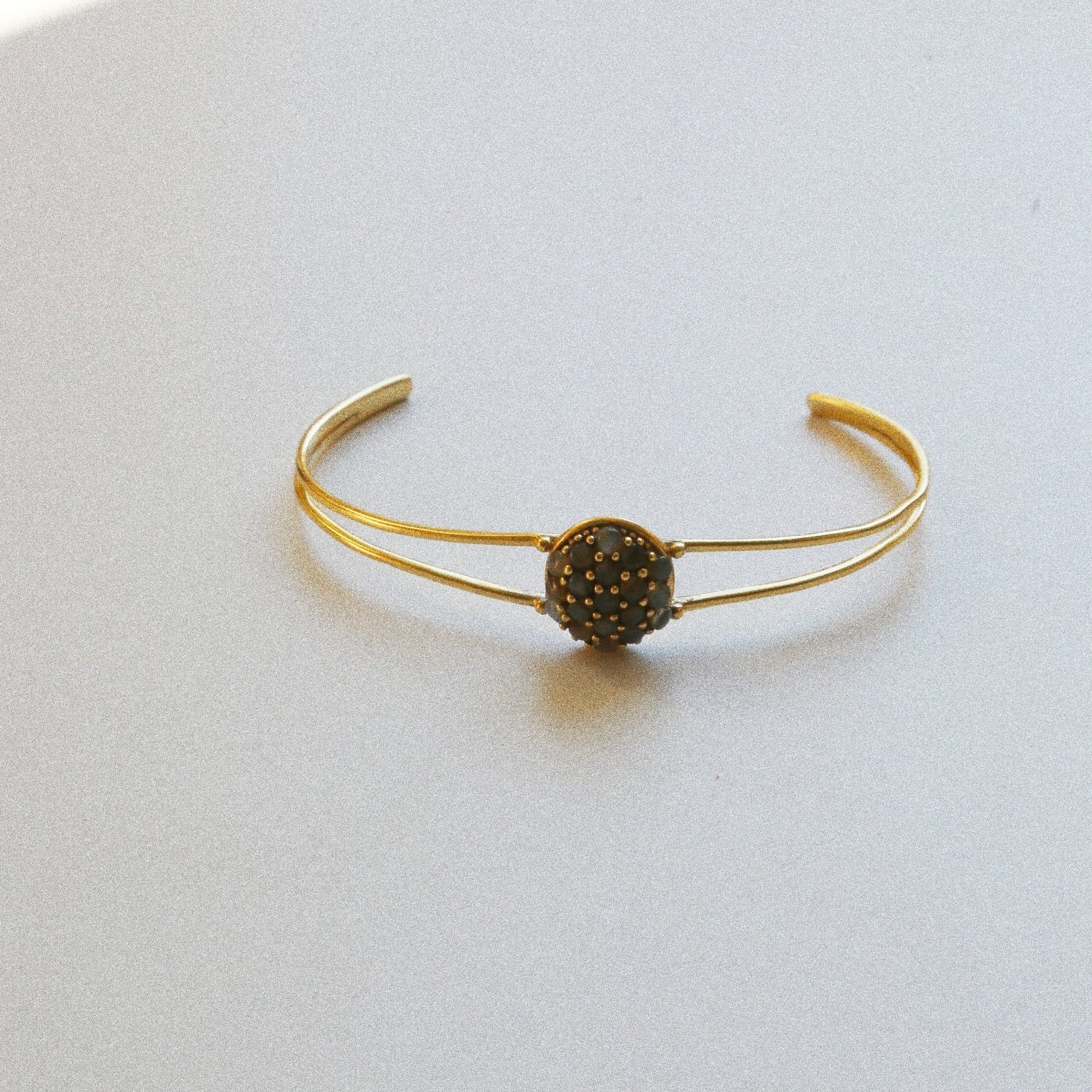 Le jonc, en acier inoxydable doré à l’or fin 18k, est ajustable pour s’adapter à chaque poignet.