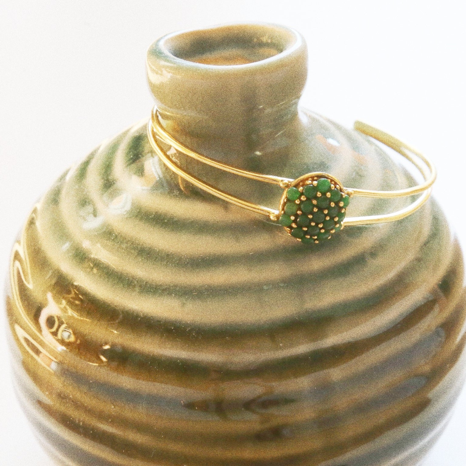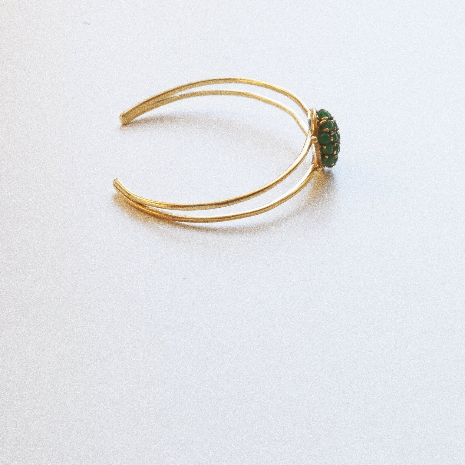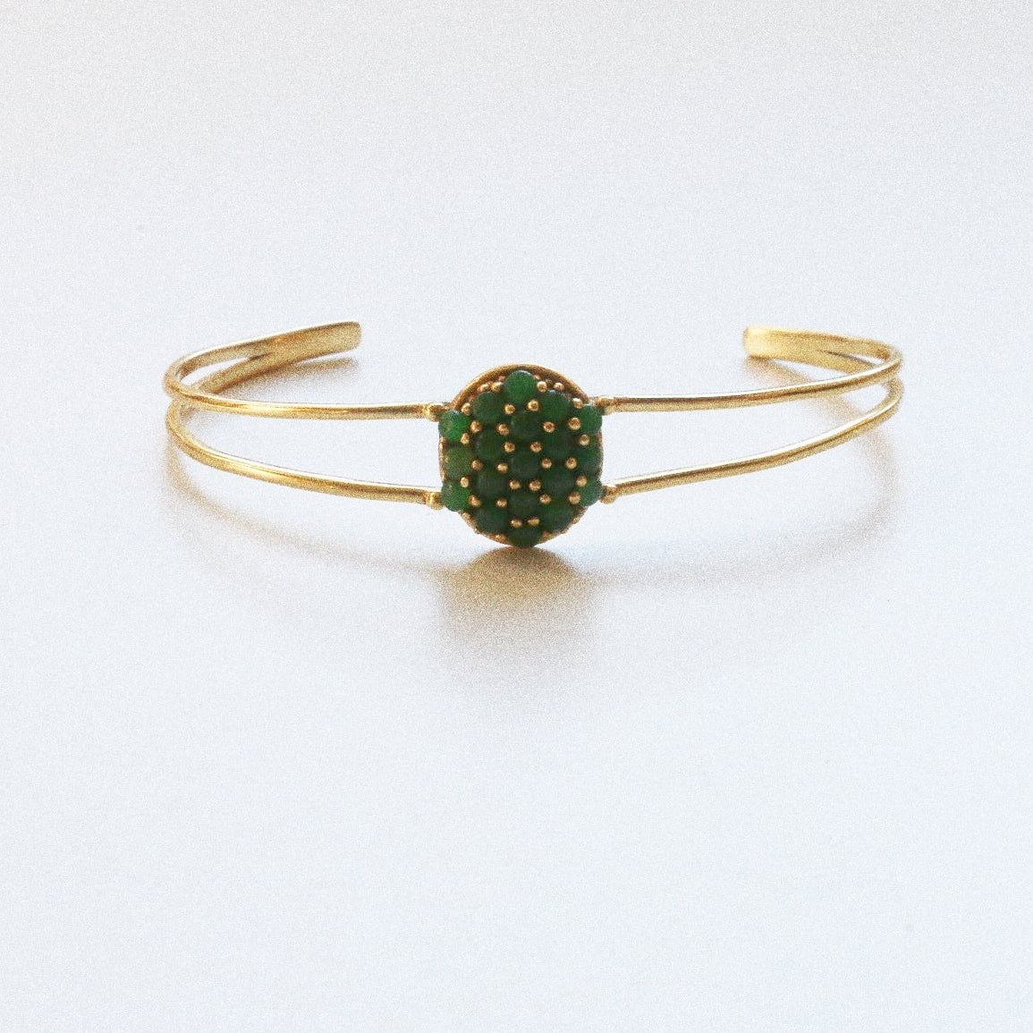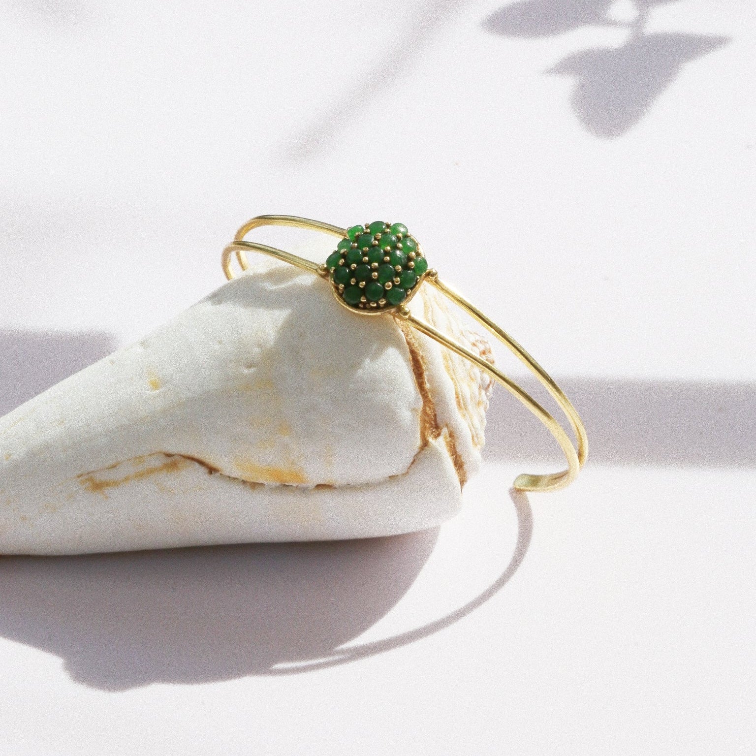 Ce bracelet jonc en malachite est une pièce d’exception, faite à la main à Jaipur, en Inde, berceau ancestral du savoir-faire joaillier.