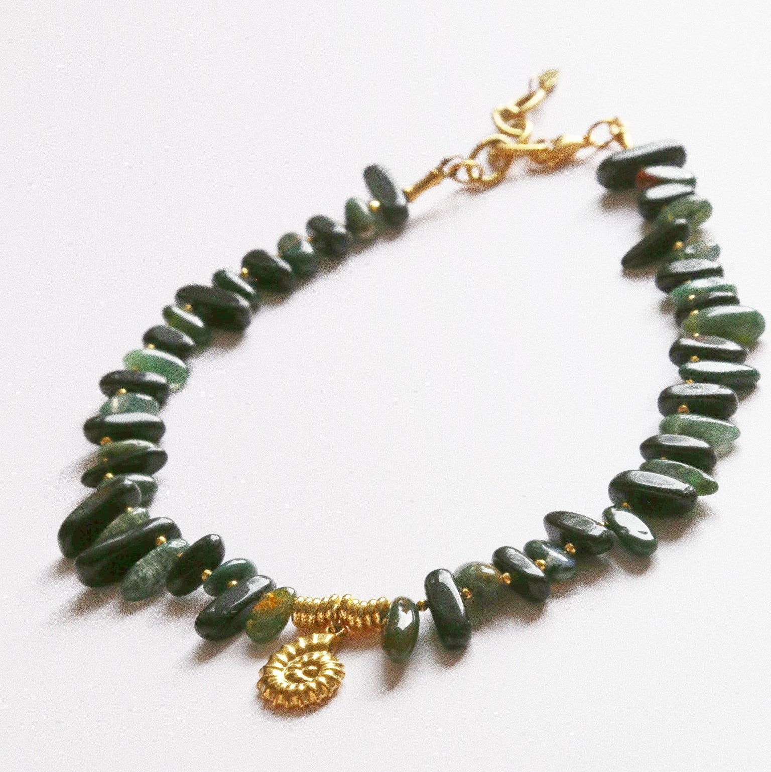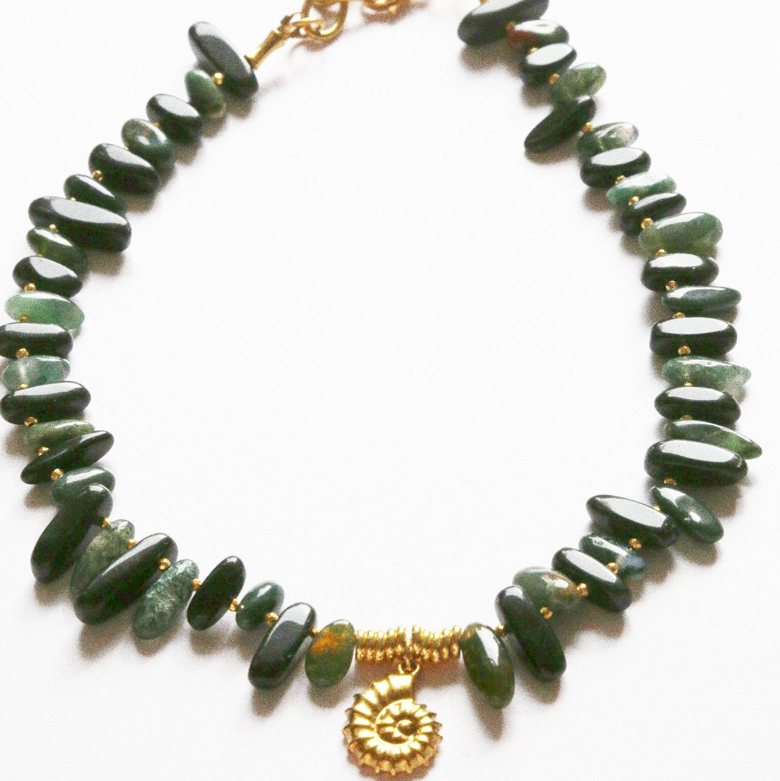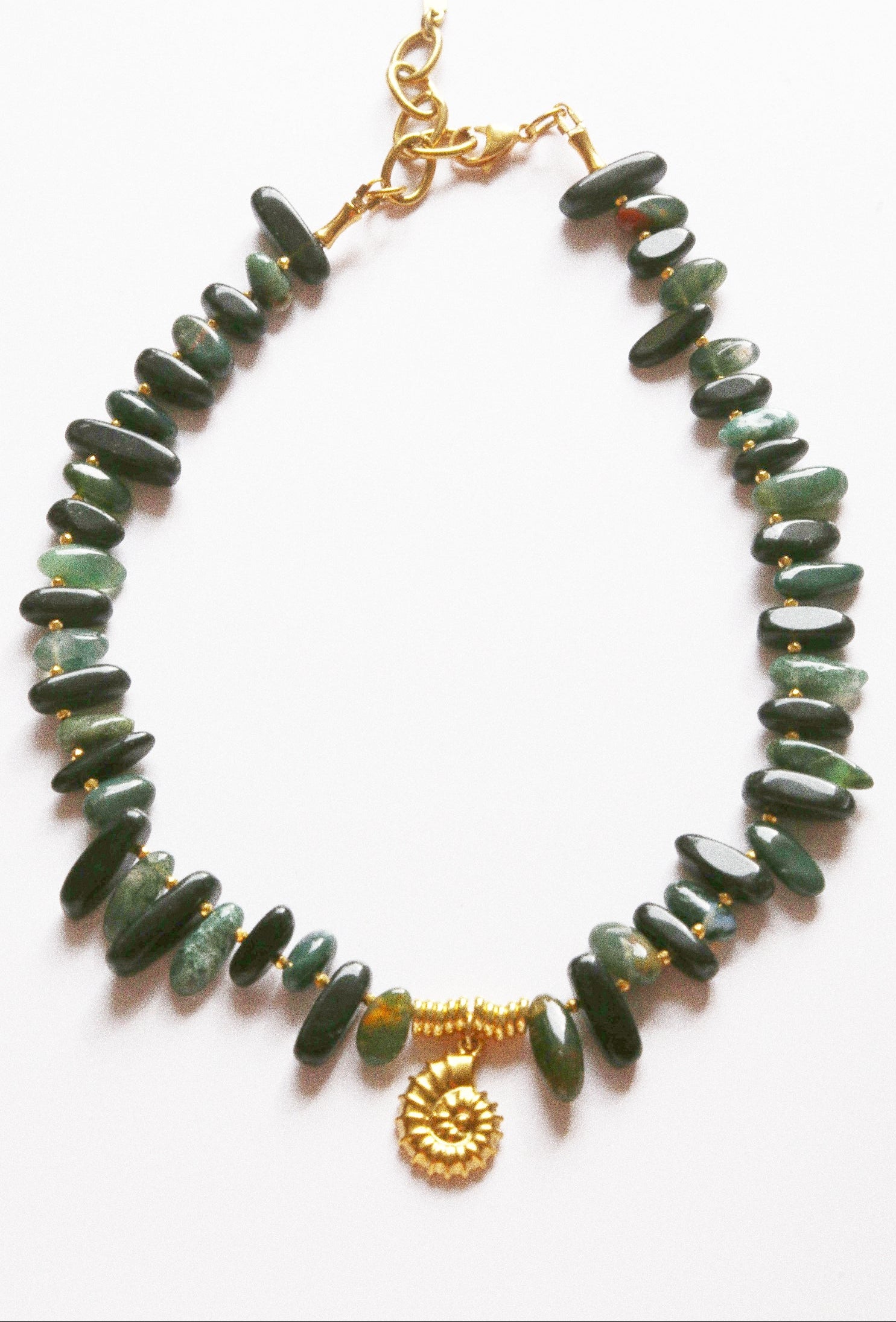 Collier – Agate Noire & Verte, Perles Dorées & Pendentif Fossile Bohème Folk