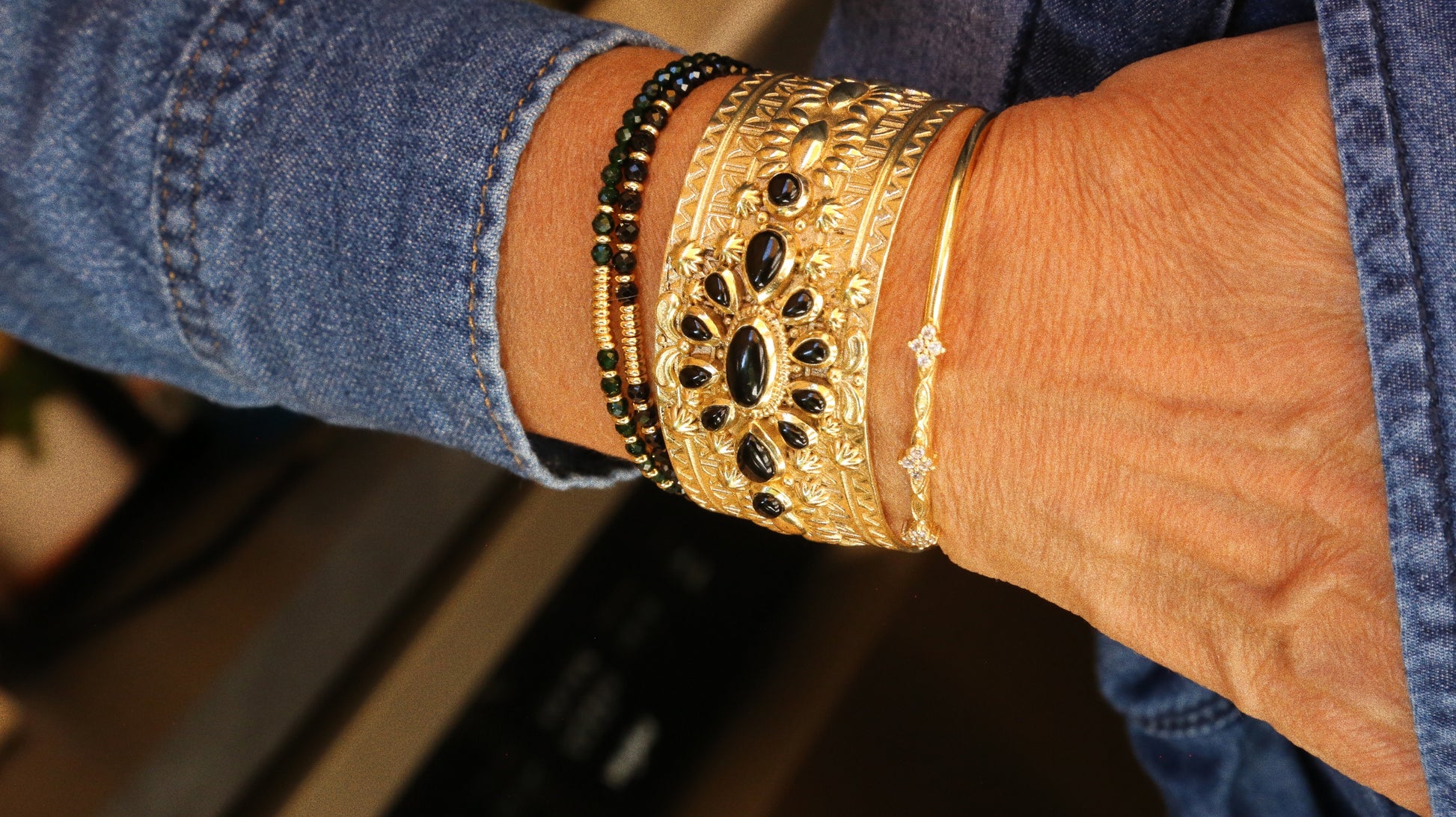 Lâalliance du dorĂ© profond et de lâĂ©clat sombre de lâonyx crĂ©e un bijou Ă la fois chic, protecteur et magnĂ©tique â un vĂ©ritable talisman de force fĂ©minine.