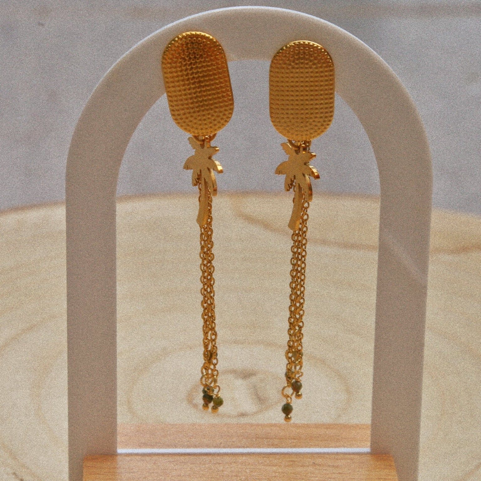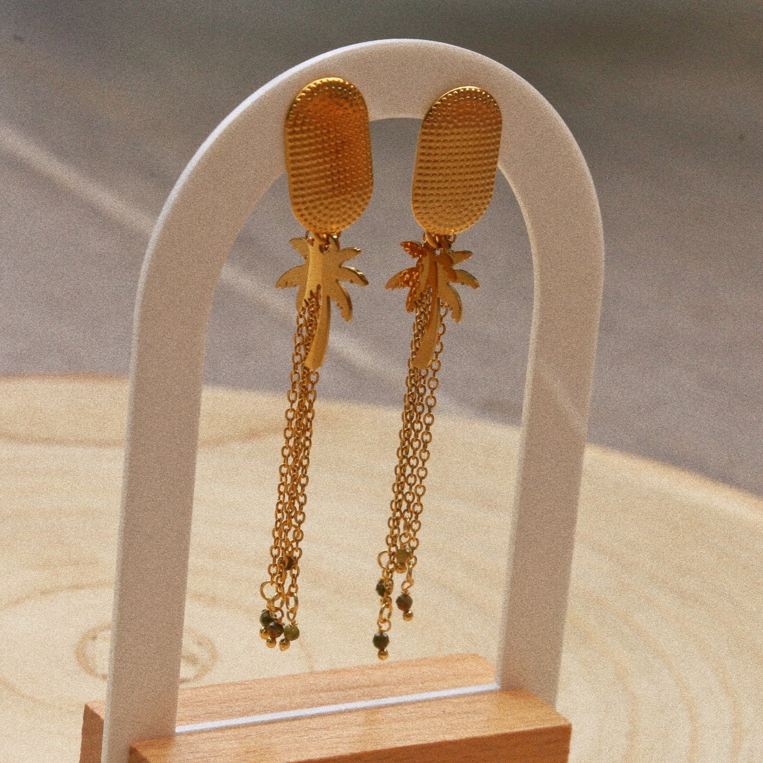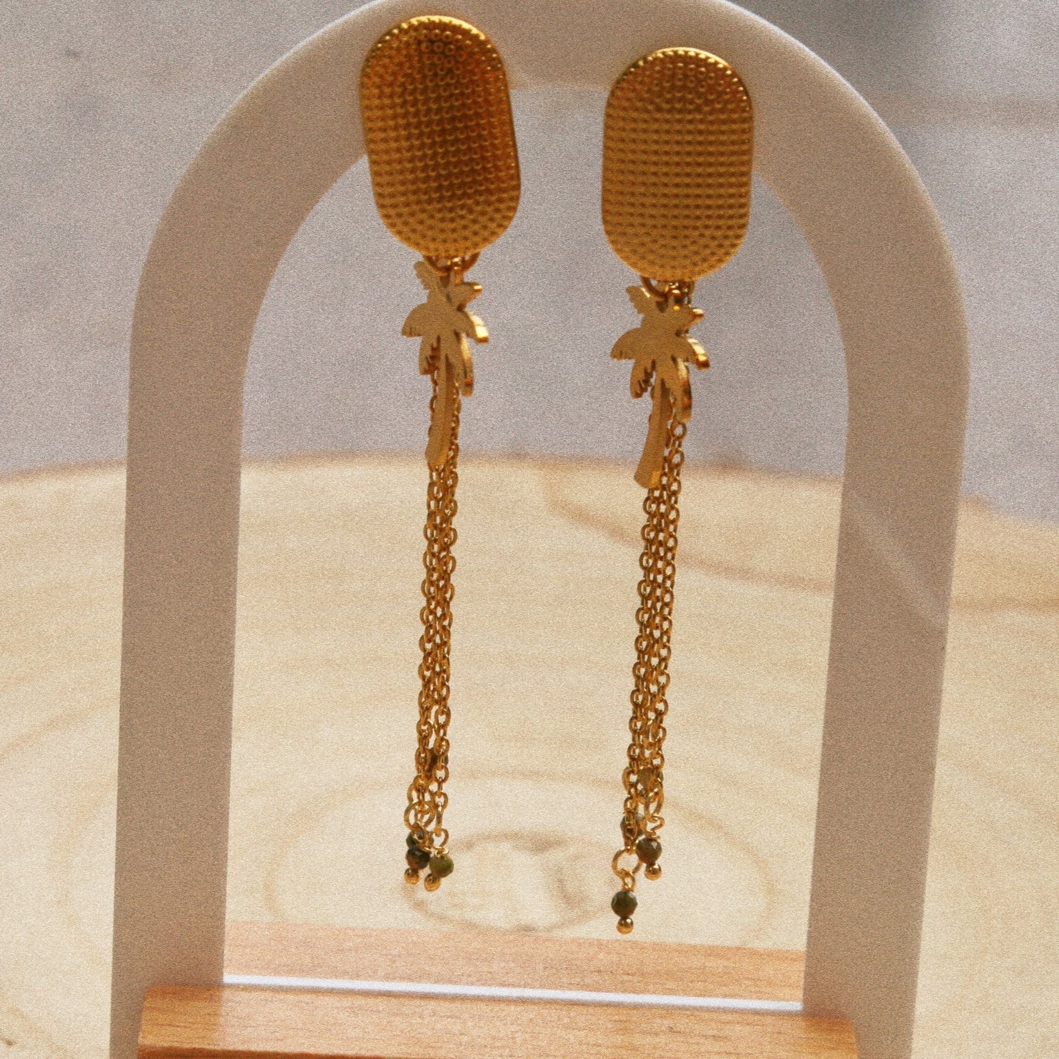 Ajoutez une touche d’exotisme et de raffinement à votre collection de bijoux avec ces boucles d’oreilles bohèmes. Confectionnées en acier inoxydable doré, elles sont décorées d’un délicat pendentif palmier et de chaînes pendantes ornées de petites pierres vertes. Un bijou lumineux, inspiré par la nature et l'été, parfait pour sublimer vos tenues en toute occasion.