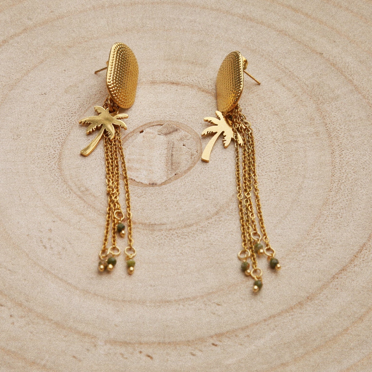 Boucles d'oreilles bohèmes dorées – Palmier & pierres vertes