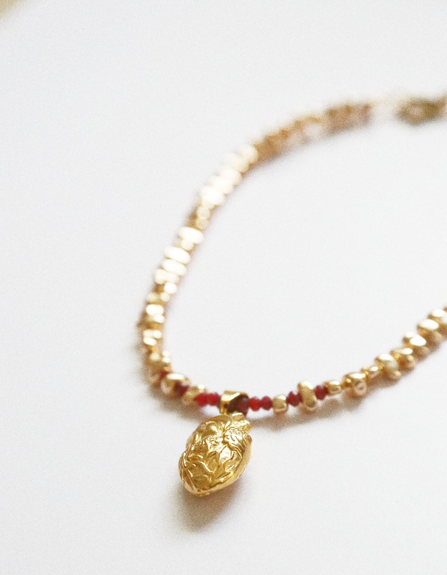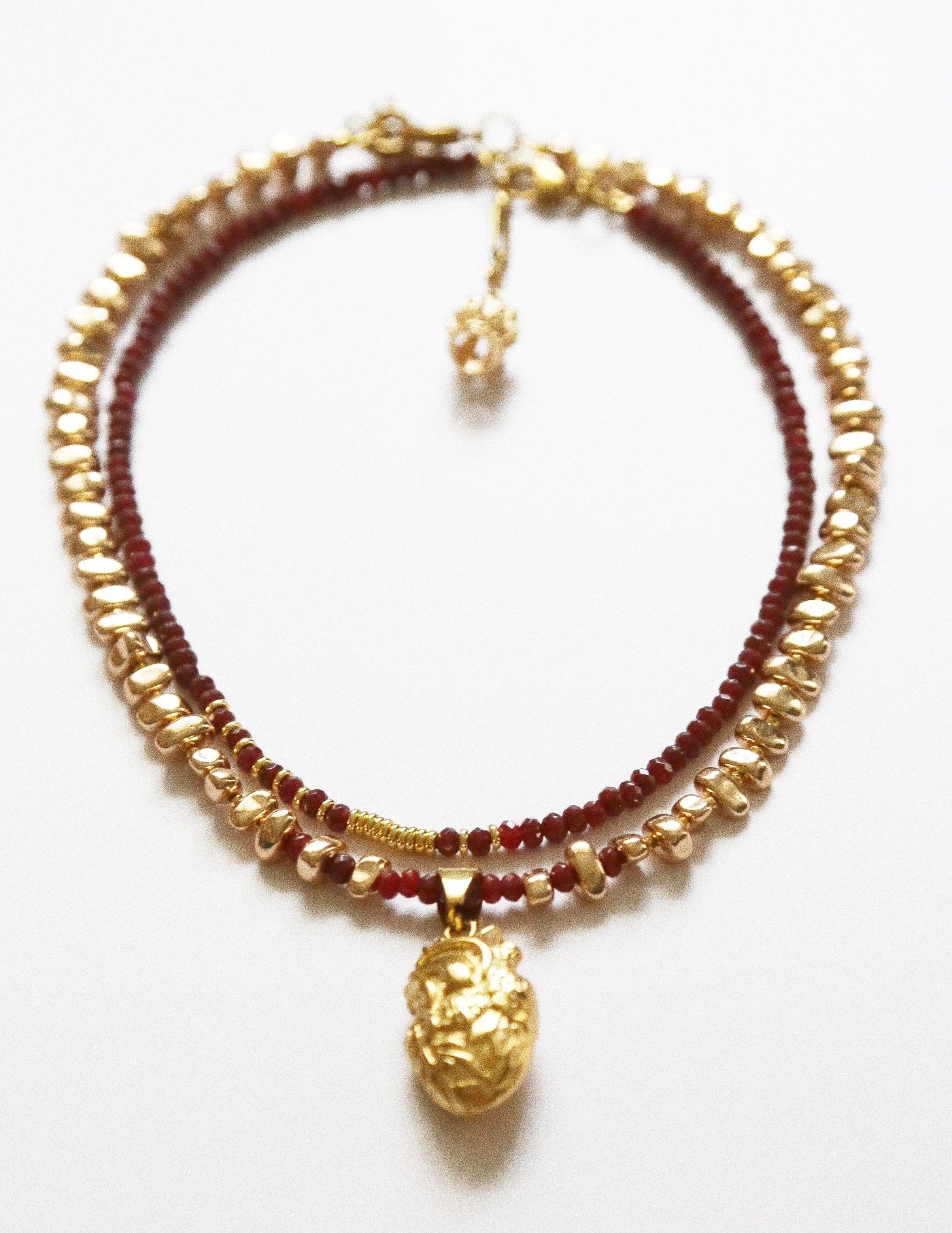 Ses perles rouge profond, couleur de vie et de courage, se mêlent à la douceur du doré, symbole de lumière et de bienveillance.