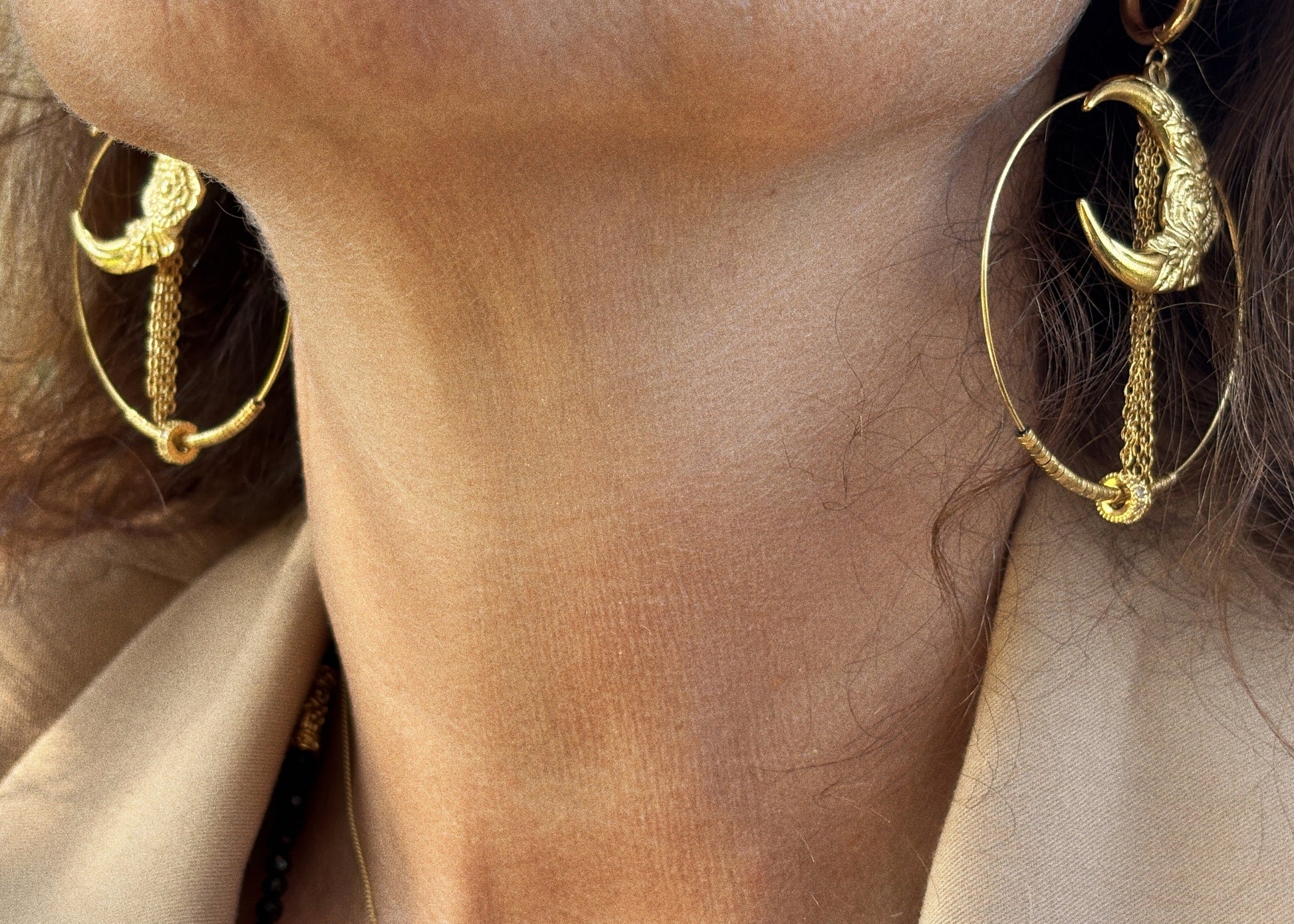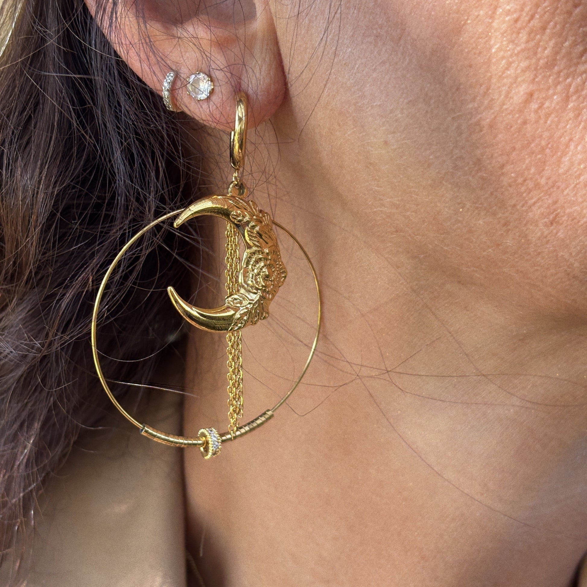 Ces créoles bohèmes en acier inoxydable captent toute la magie de la lune. Leur délicat pendentif lunaire symbolise l’intuition et la féminité, tandis que les perles en hématite apportent protection et ancrage. Le donut en strass transparent reflète la lumière avec éclat, offrant une touche chic et spirituelle.