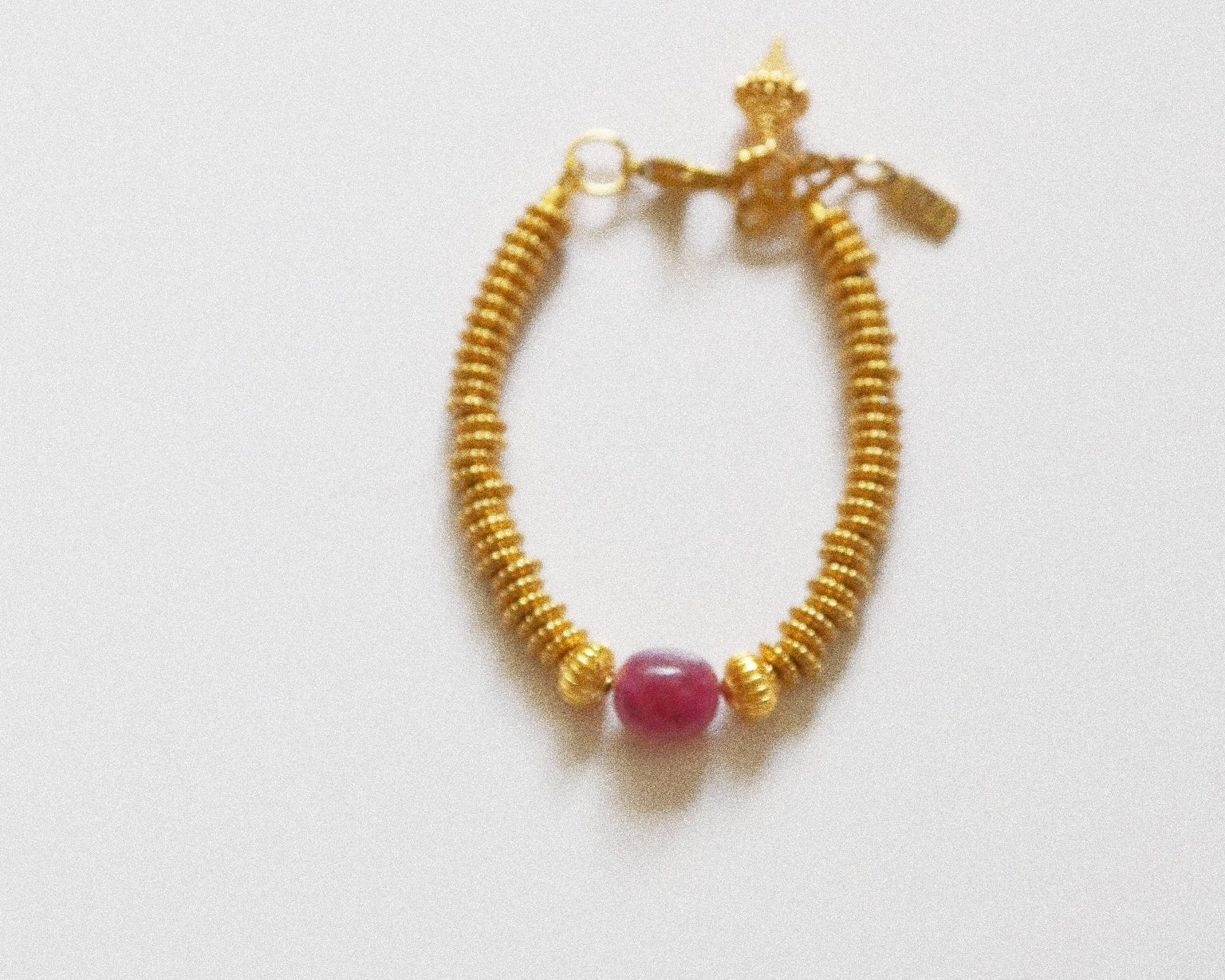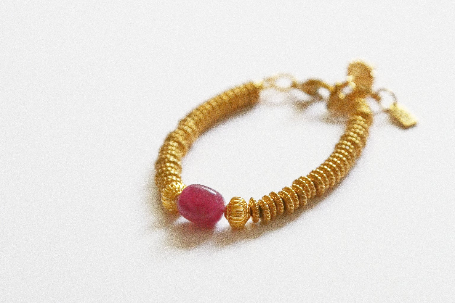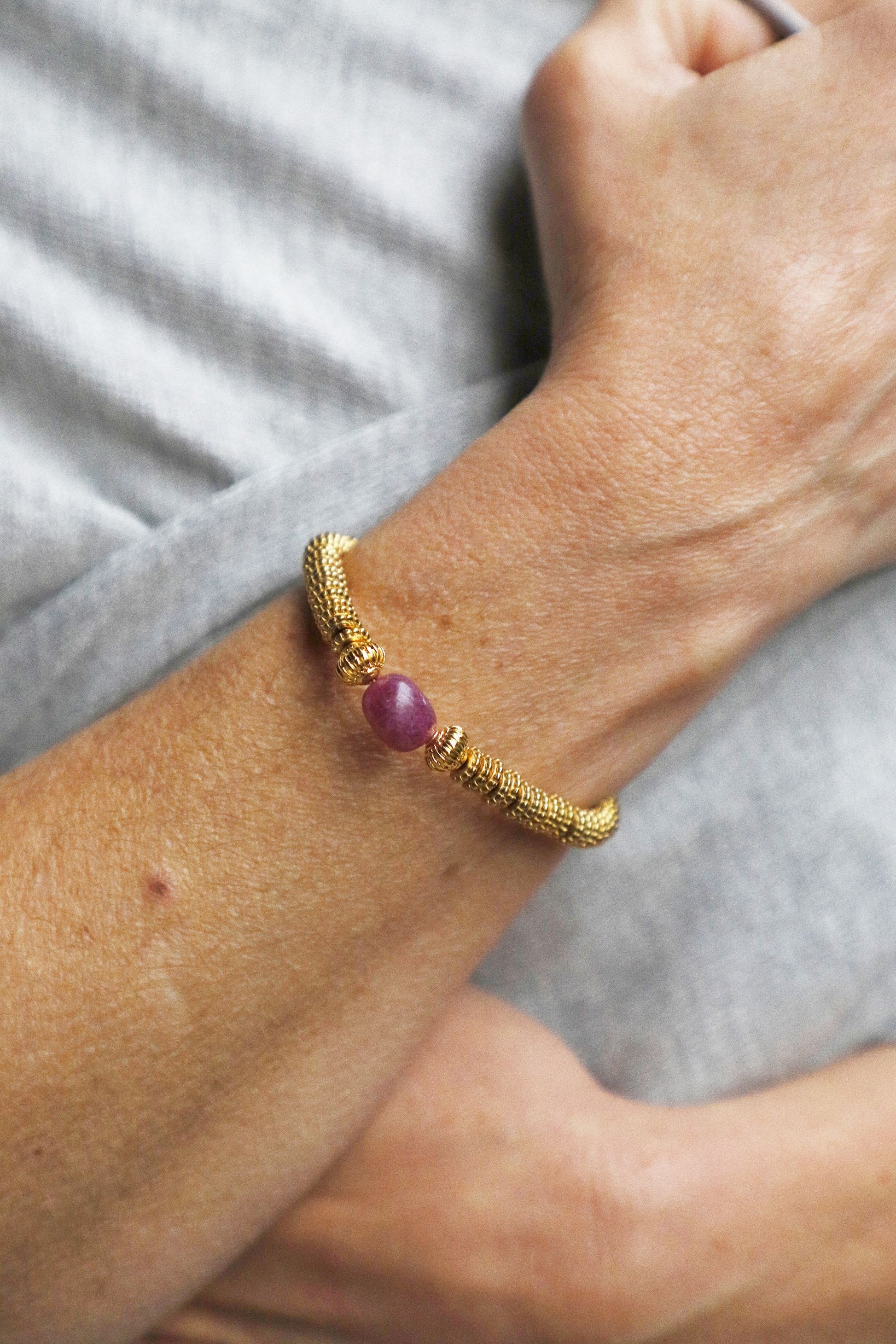 Ce bracelet raffiné allie la douceur du doré à la profondeur vibrante de la tourmaline prune naturelle, pierre d’harmonie émotionnelle et de renaissance intérieure.